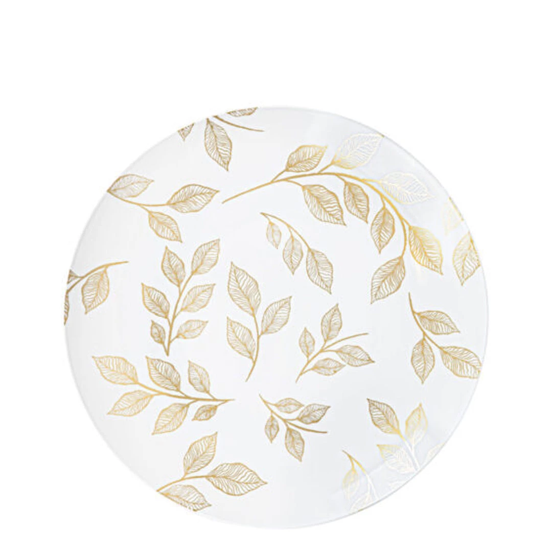 This luxurious disposable plastic plate easily gives sophisticated flair to a variety of different events. Leaves and florals everywhere… a tasteful medley of garden life. Use this authentic looking set for an elegant, but dainty scape. Great for family dinners, birthdays, celebrations, Weddings, Receptions, Baby showers, Banquets, Thanksgiving, Halloween, Christmas Holiday, Family Gatherings, business dinners and basically any event where you want your guests to feel warm, welcoming, and truly magical.