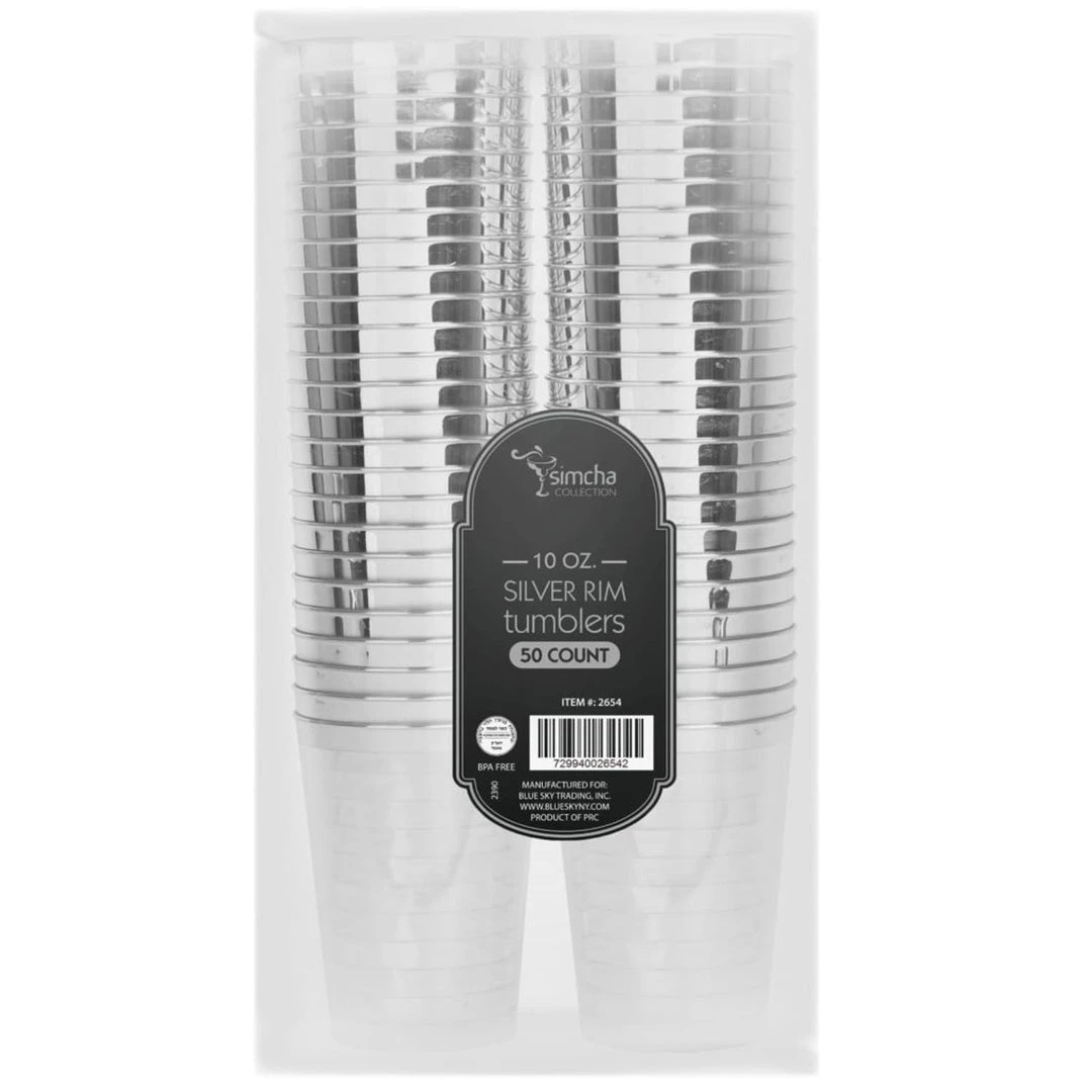 Fancy Disposable 10 oz Tumbler with Silver Rim – 50 Cups per Package. Place a stack of SILVER TUMBLERS at your self-serve bar or beverage station for guests to help themselves during your reception or stock your reception bar so the bar tender will have plenty of cups for serving drinks throughout