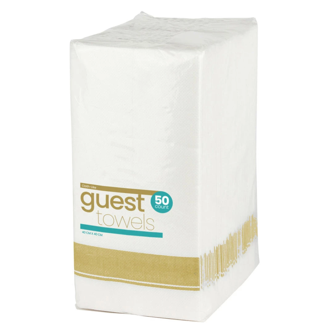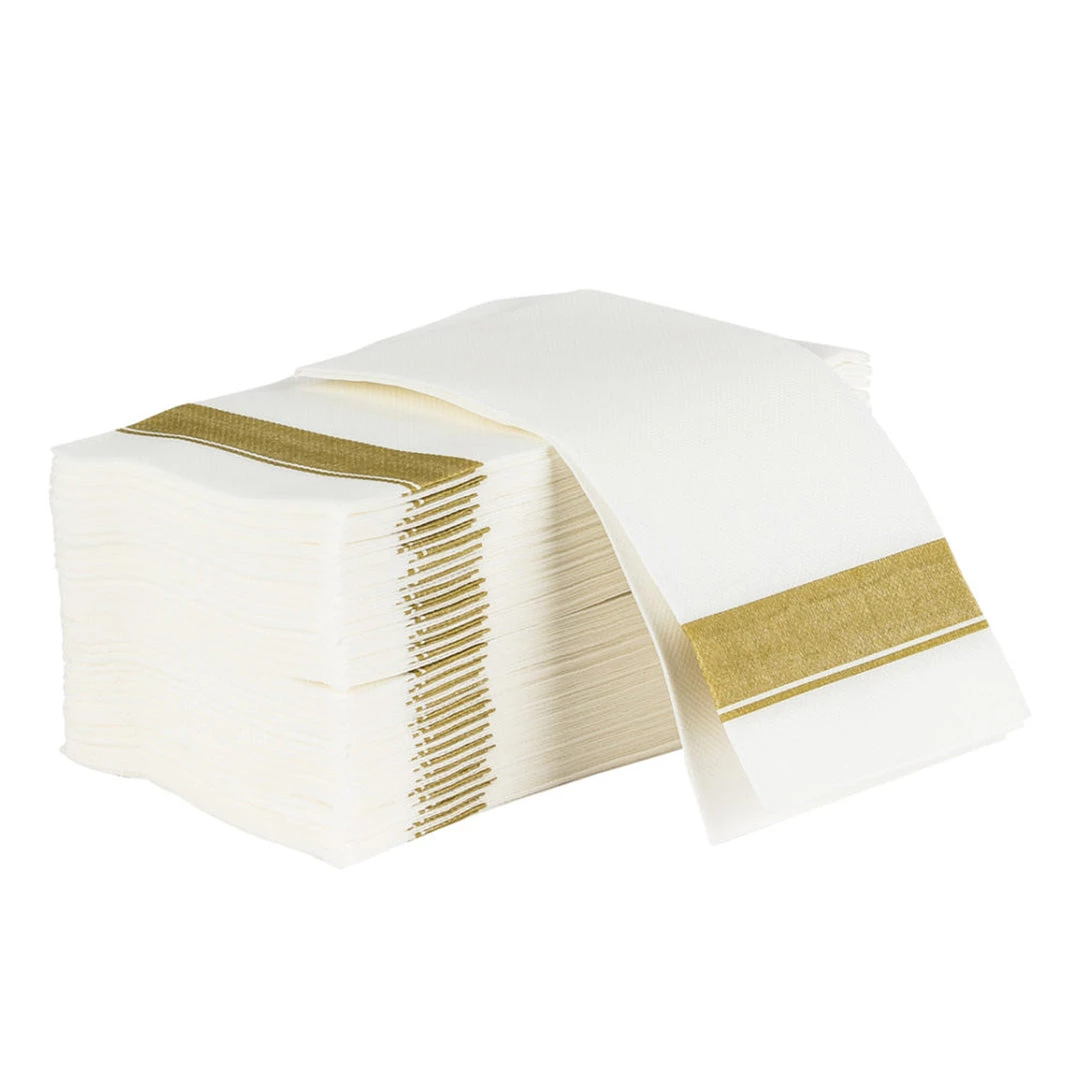 Make your dinner event extraordinary with these designer cloth-like napkins. The classy gold border adds a pop of color to table settings and tying together the décor at upscale parties and catered events.