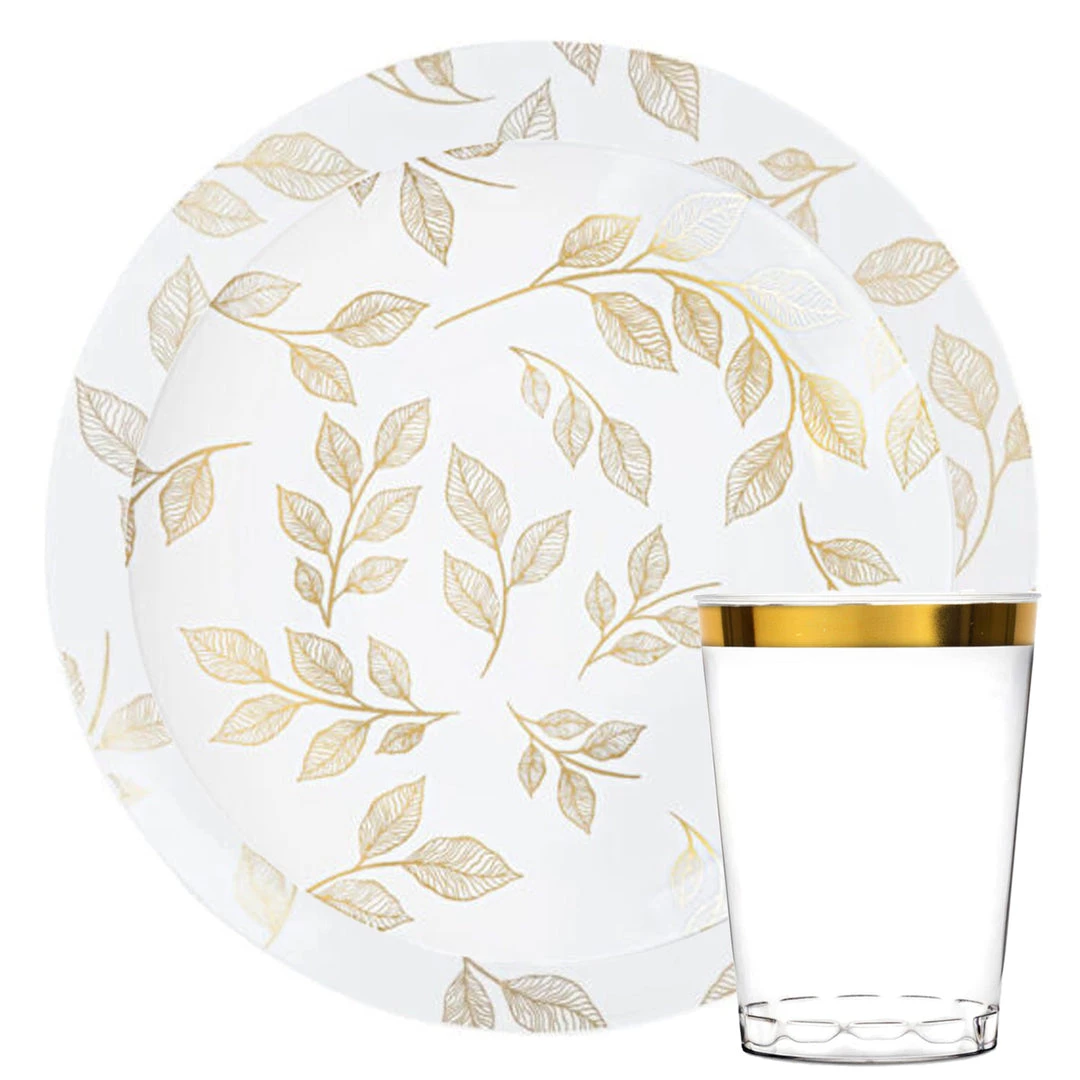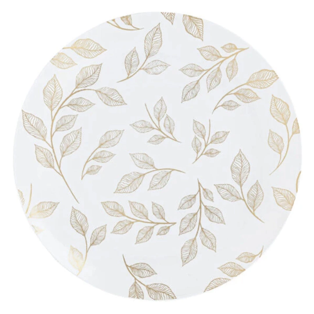 This luxurious disposable plastic plate easily gives sophisticated flair to a variety of different events. Leaves and florals everywhere… a tasteful medley of garden life. Use this authentic looking set for an elegant, but dainty scape. Great for family dinners, birthdays, celebrations, Weddings, Receptions, Baby showers, Banquets, Thanksgiving, Halloween, Christmas Holiday, Family Gatherings, business dinners and basically any event where you want your guests to feel warm, welcoming, and truly magical.