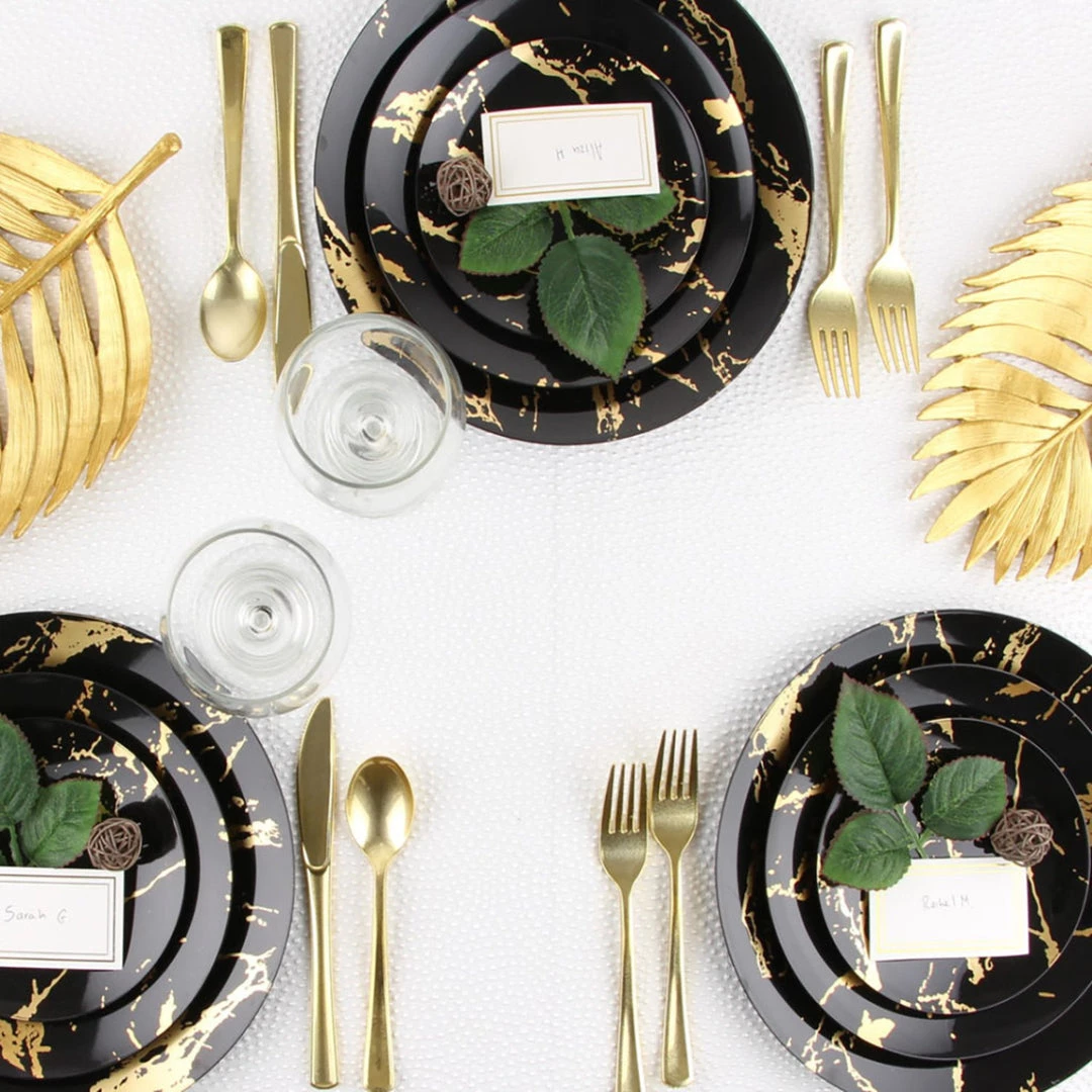 Made of durable plastic, this elegant set of plastic china has a beautiful gold stroke design across each plate. Perfect for fine dining.