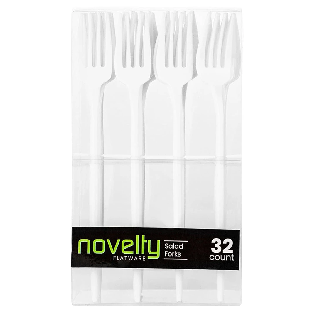 Novelty Plastic Flatware Disposable White Salad forks 32 Count, This beautiful and modern White plastic silverware set is composed of high-rated heavyweight plastic materials rendering it strong enough for every type of food you might be serving. These flatware are 100% food grade and safe to use for a fine dining experience.