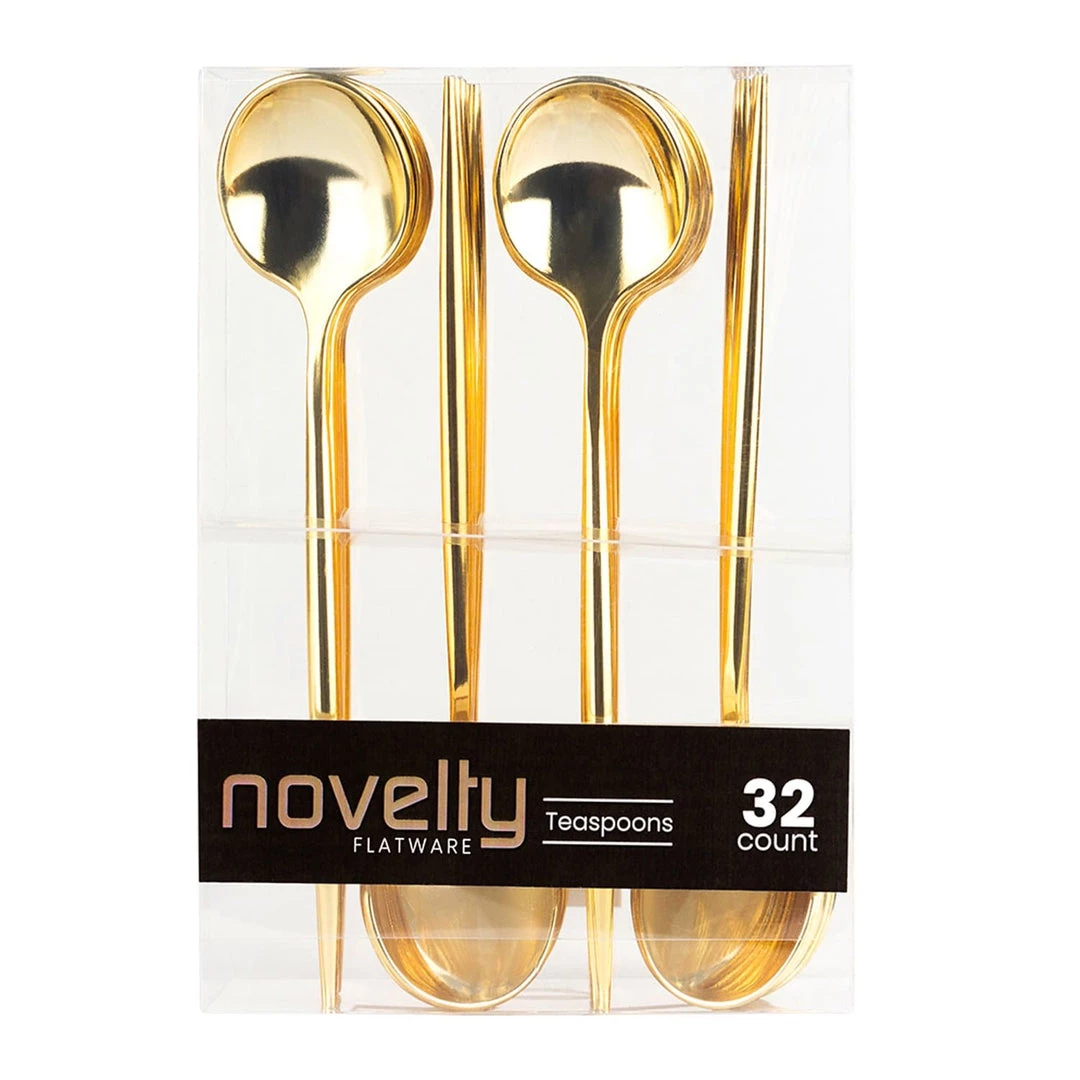 Novelty Plastic Flatware Disposable Gold Tea Spoons 32 Count, This beautiful and modern gold plastic silverware set is composed of high-rated heavyweight plastic materials rendering it strong enough for every type of food you might be serving. These flatware are 100% food grade and safe to use for a fine dining experience.