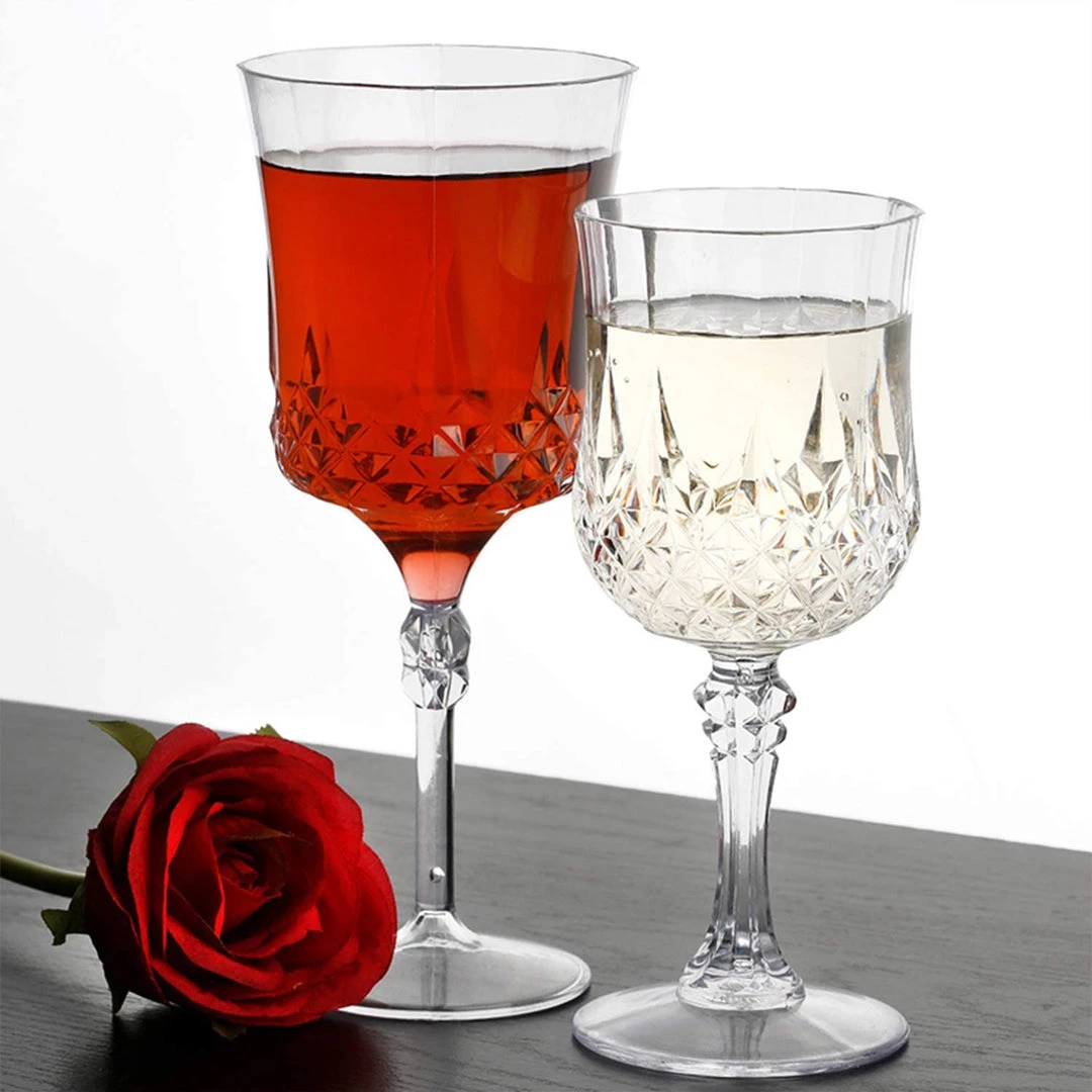 As you set the perfect matching table for your wedding, birthday, shower, or another event, you need the Elegant Plastic wine glasses that match the rest of your fabulous décor — and these beautiful crystal cut Plastic wine glasses are surely the best possible choice. Each wine glass comes with a delicate crystal cut design on the lower portion of the glass, adding a note of elegance that will be sure to stand out from the crowd.