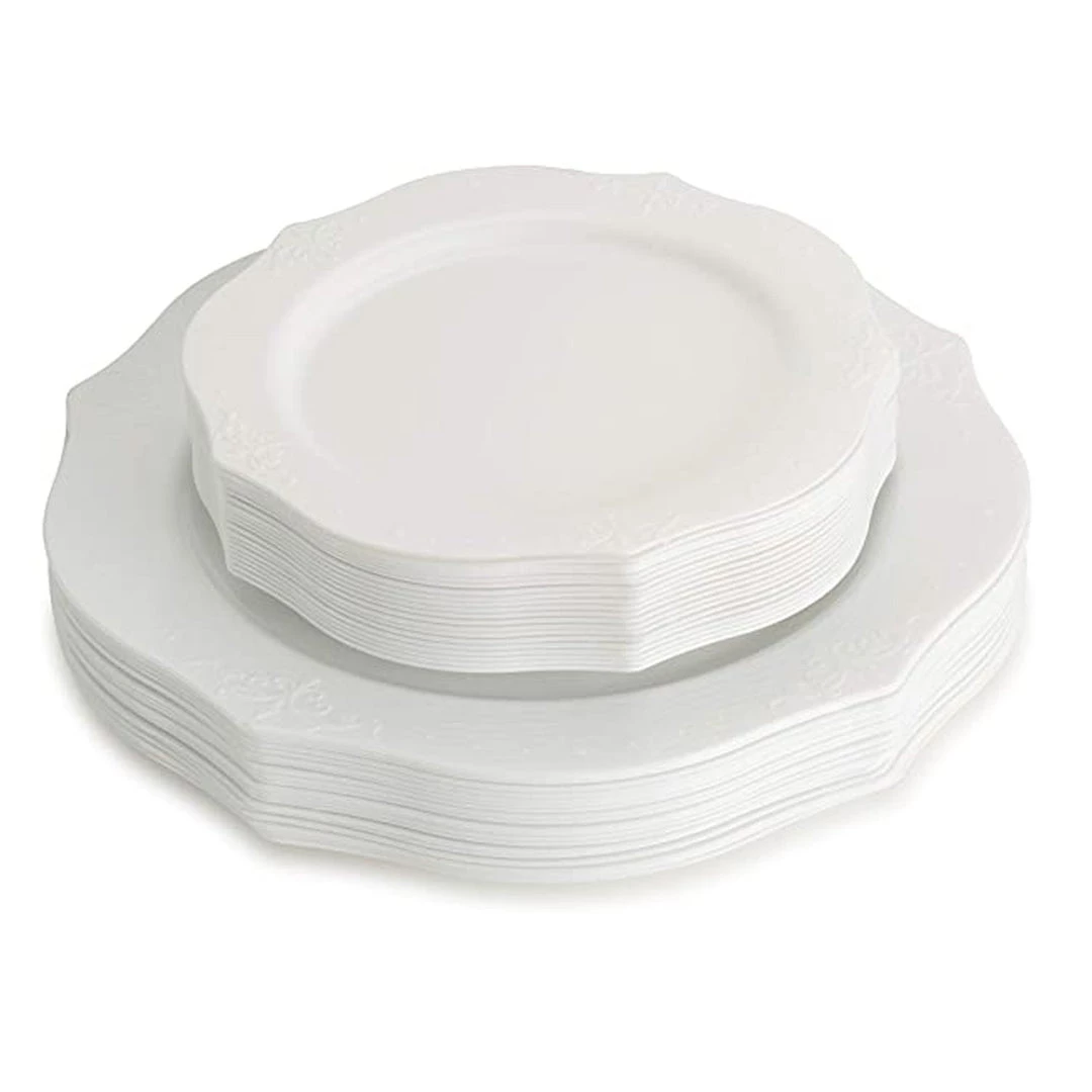 Elegant plastic disposable plate with nice design. Disposable plates are the most convenient when preparing for an event. Your table will have the sumptuous look of real China for a lesser significant cost. Elegant design, ideal for celebrations such as weddings, special event dinners, Christmas, New Year and Valentine’s Day, birthday parties…They can also be used for all outdoor activities like barbecues, camping, village – garden or fire festivals. Comparable to the plates of cardboard or thin plastic, with our products you will get a similar look of a true porcelain at a fraction of the price. Each package contains 20 elegant plates. You can choose to transfer or re-use these plates for another occasion. They have excellent quality and can be cleaned and reused for future events. Do not use in the microwave.