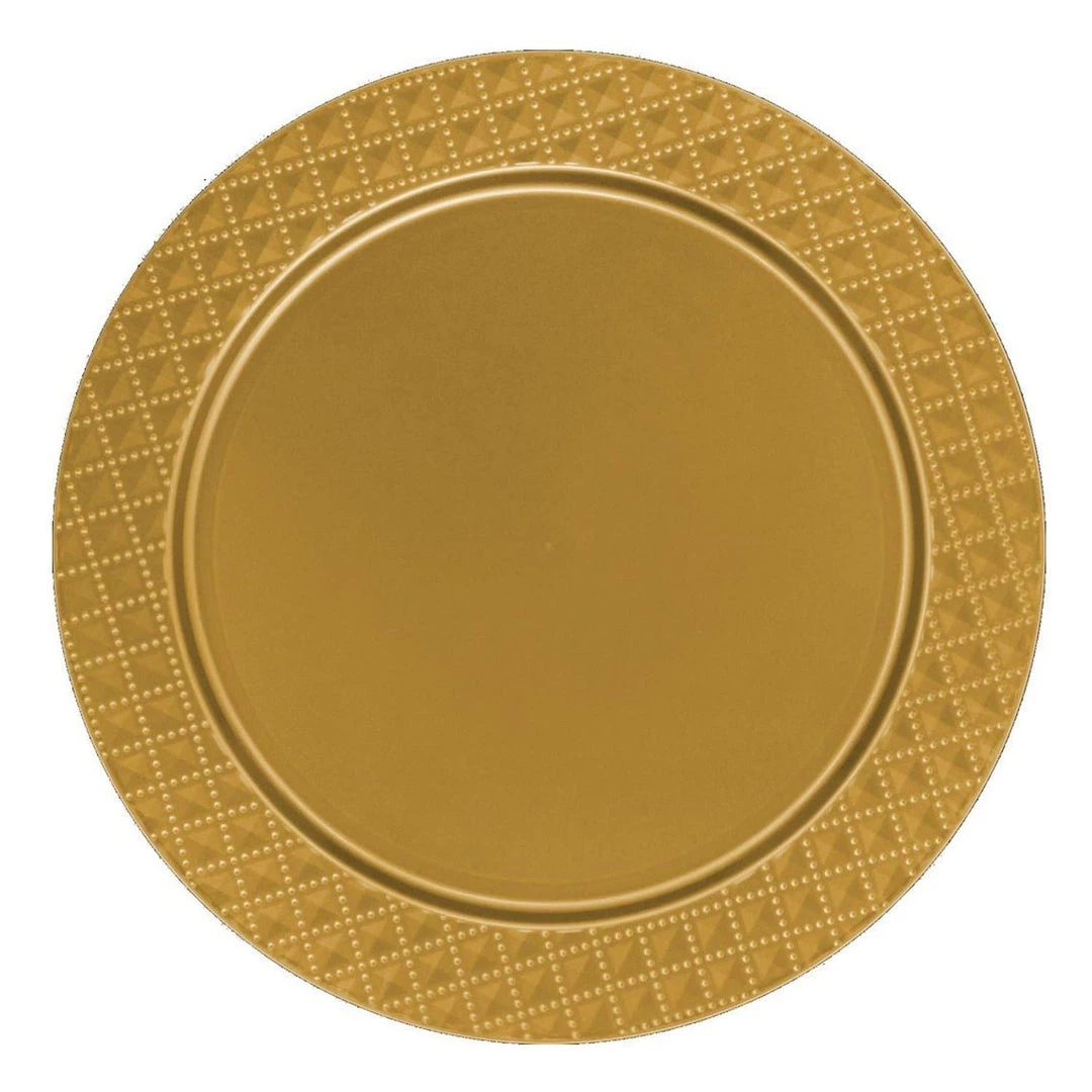 - Elegant Embossed Diamond Design Gold Colored Plastic Charger Plate.