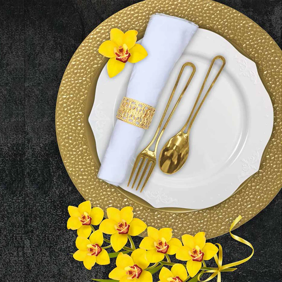 - Elegant Embossed Hammered Design Gold Colored Plastic Charger Plate.