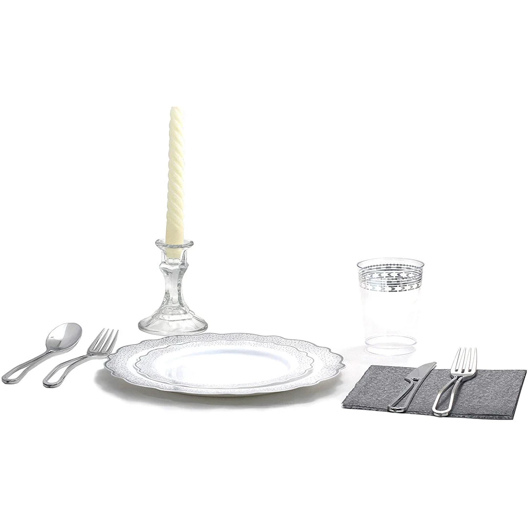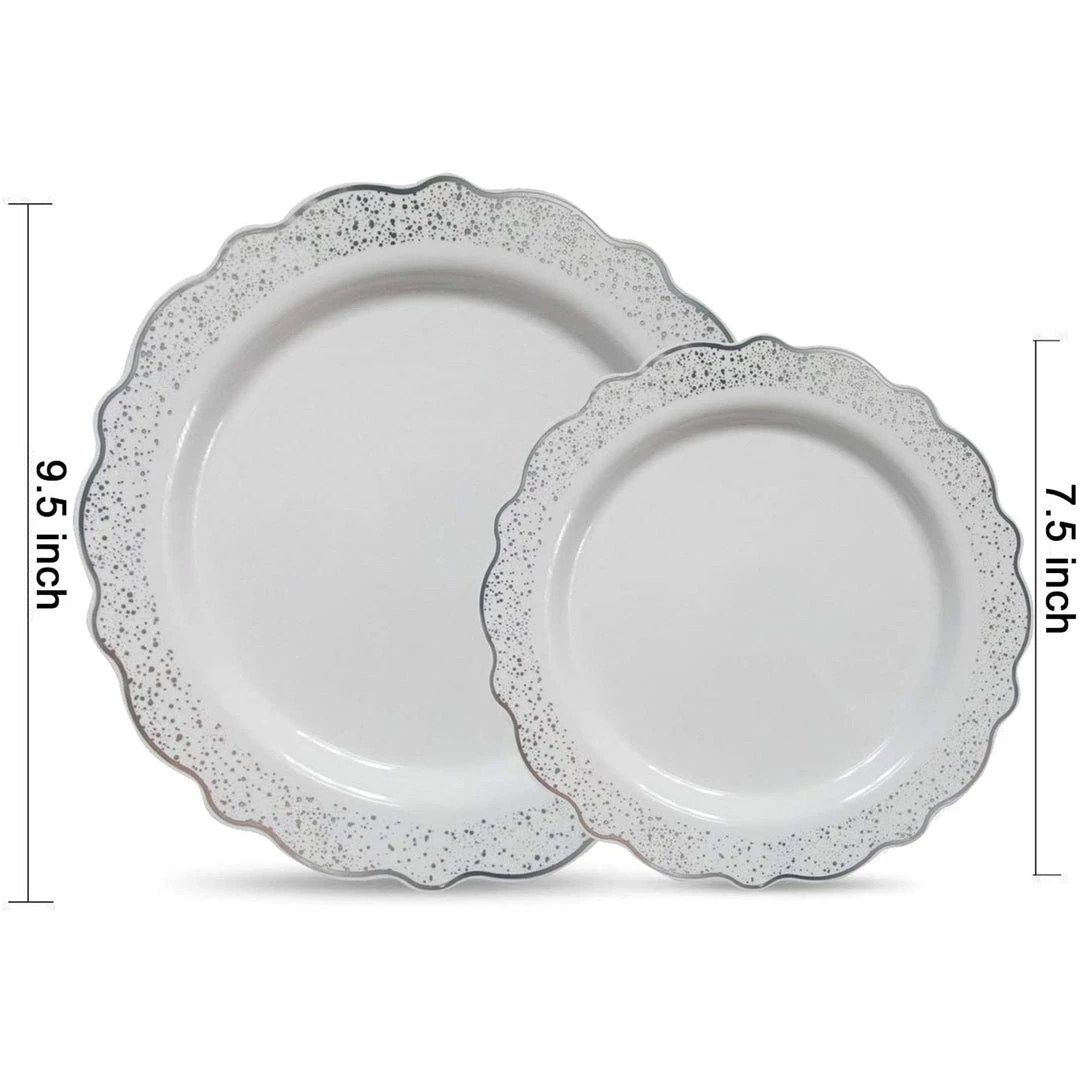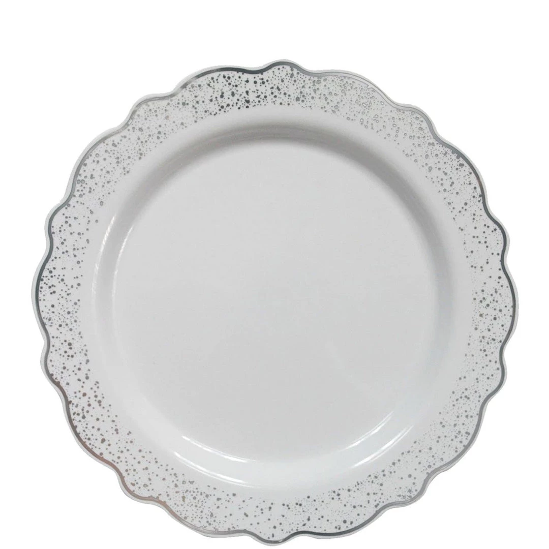 Set your table with Elegance!! Enjoy our new line of Decorline Elegant Disposable Confetti Dinner Plates. This unique White plate with Silver border is great to use at any formal function. Perfect for Weddings, Dinners, Parties etc.
