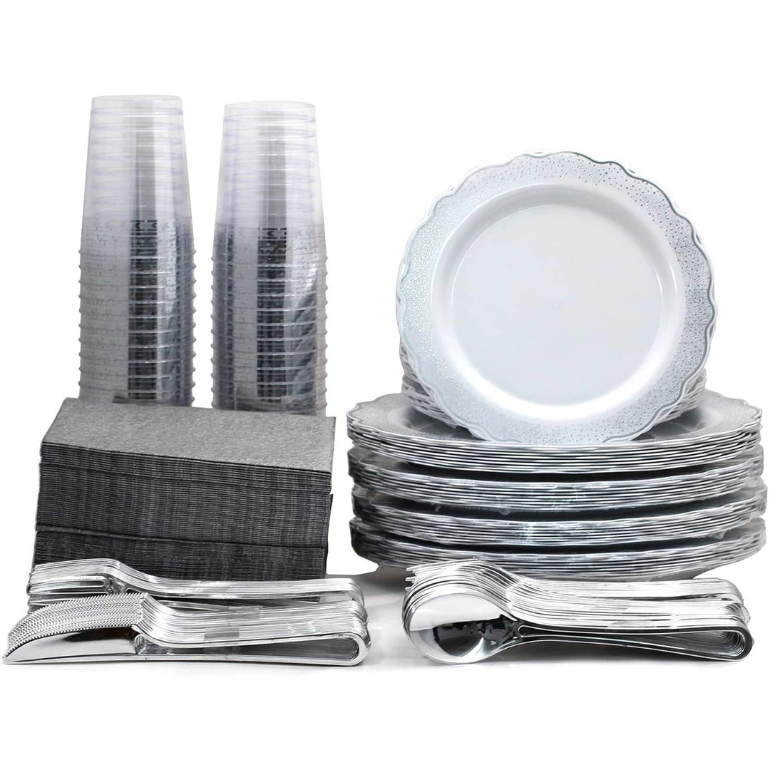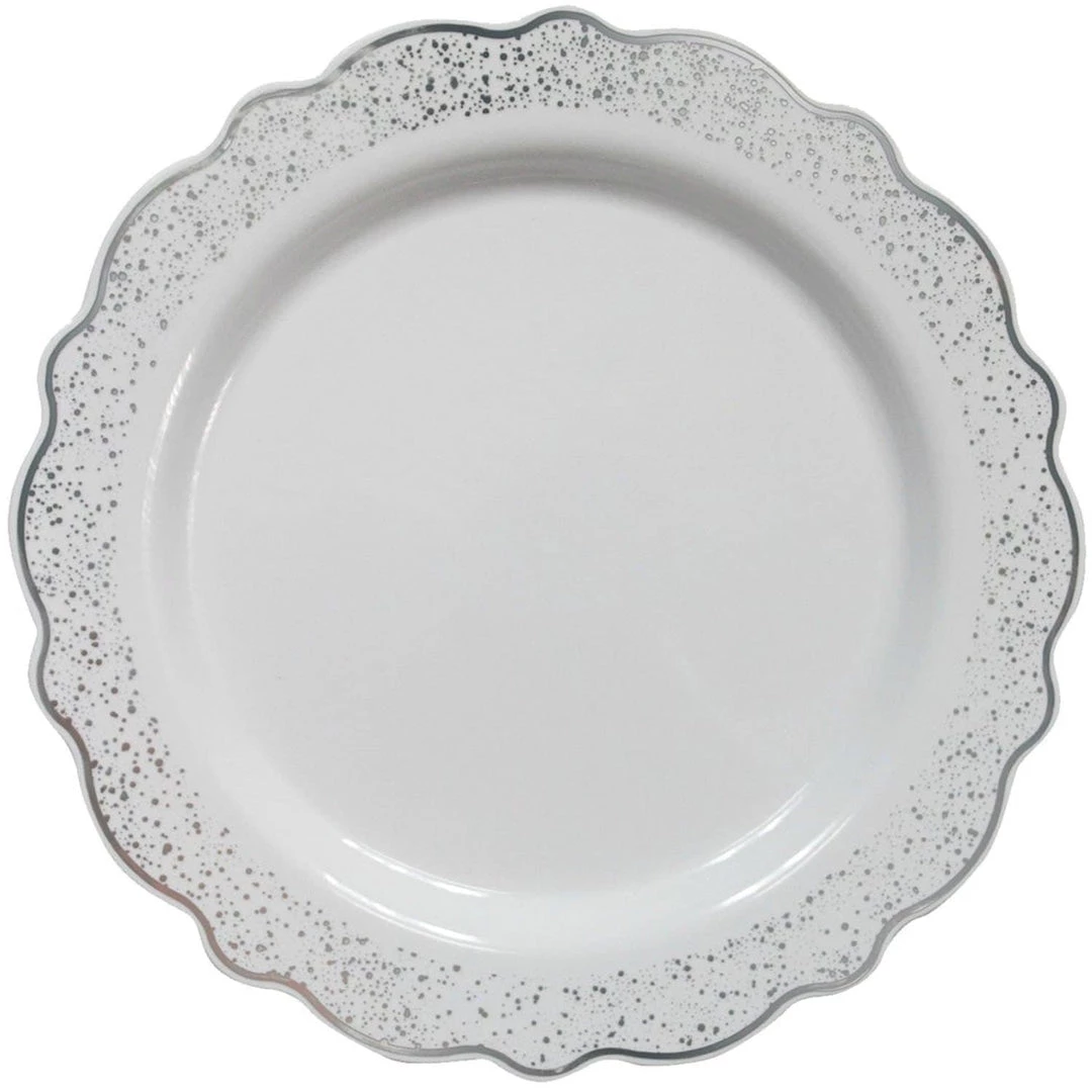 Set your table with Elegance!! Enjoy our new line of Decorline Elegant Disposable Confetti Dinner Plates. This unique White plate with Silver border is great to use at any formal function. Perfect for Weddings, Dinners, Parties etc.