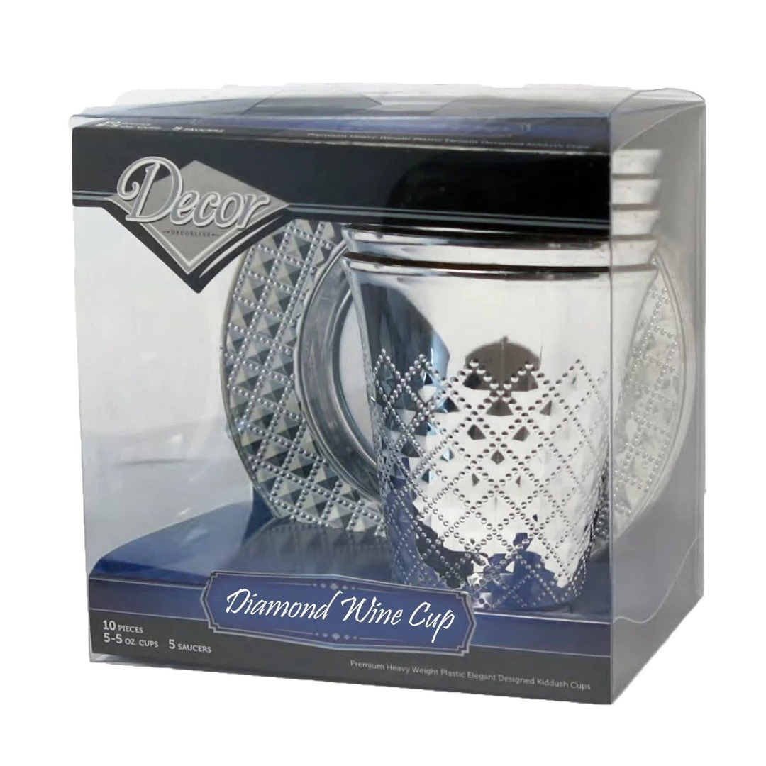 Elegant plastic disposable silver wine cups and saucers with diamond look and nice design. Disposable cups,plates, cutlery and napkins are the most convenient when preparing for an event. Your table will have the sumptuous look of real China for a lesser significant cost. These wine cups are ideal for celebrations such as weddings, special event dinners, Christmas, New Year, Valentine’s Day, birthday parties…They can also be used for all outdoor activities like barbecues, camping, village – garden or fire festivals. Comparable to the plates of cardboard or thin plastic, with our products you will get a similar look of a true porcelain at a fraction of the price. Each package contains 5 wine cups and 5 saucers. You can choose to transfer or re-use these plates, cups and cutlery for another occasion. They have excellent quality and can be cleaned and reused for future events. Do not use in the microwave.