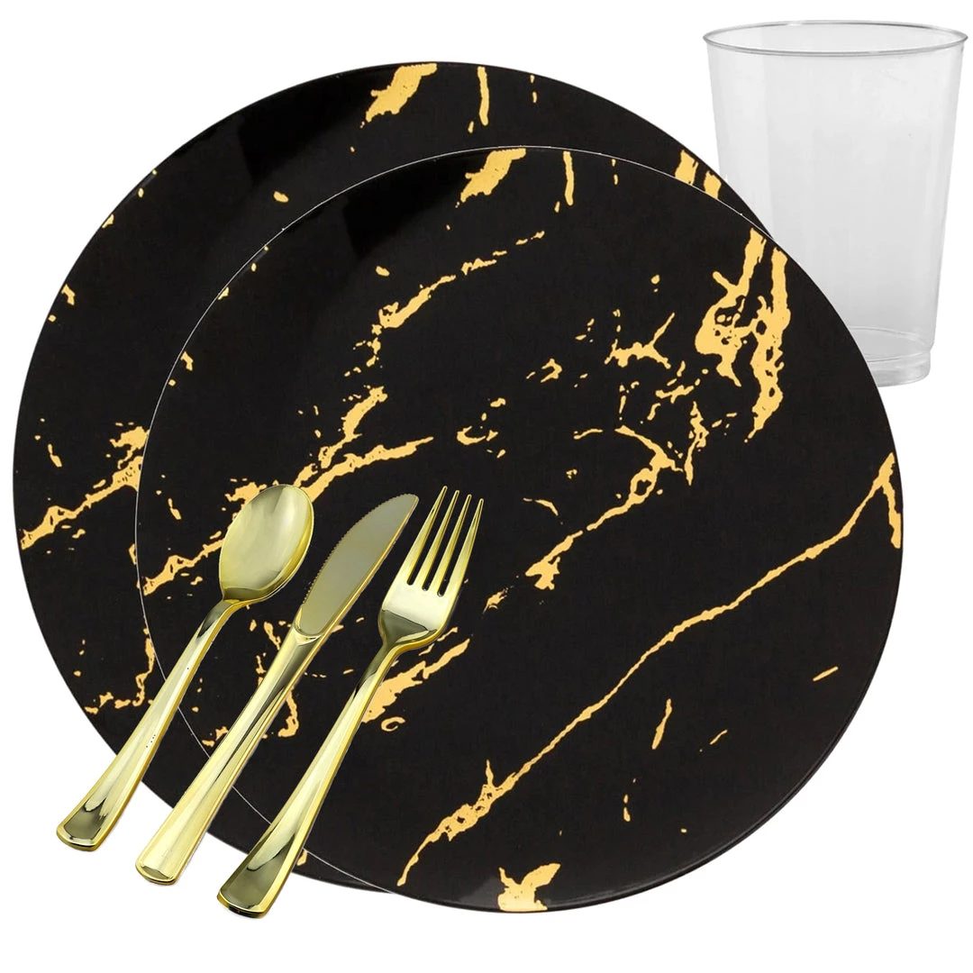 Made of durable plastic, this elegant set of plastic china has a beautiful gold stroke design across each plate. Perfect for fine dining. These Black Gold Stroke Dinner plate are great to use at any formal function. Perfect for Weddings, Dinners, Parties etc.