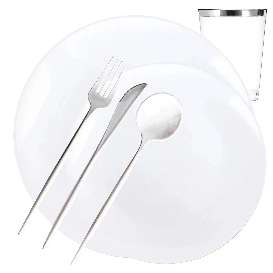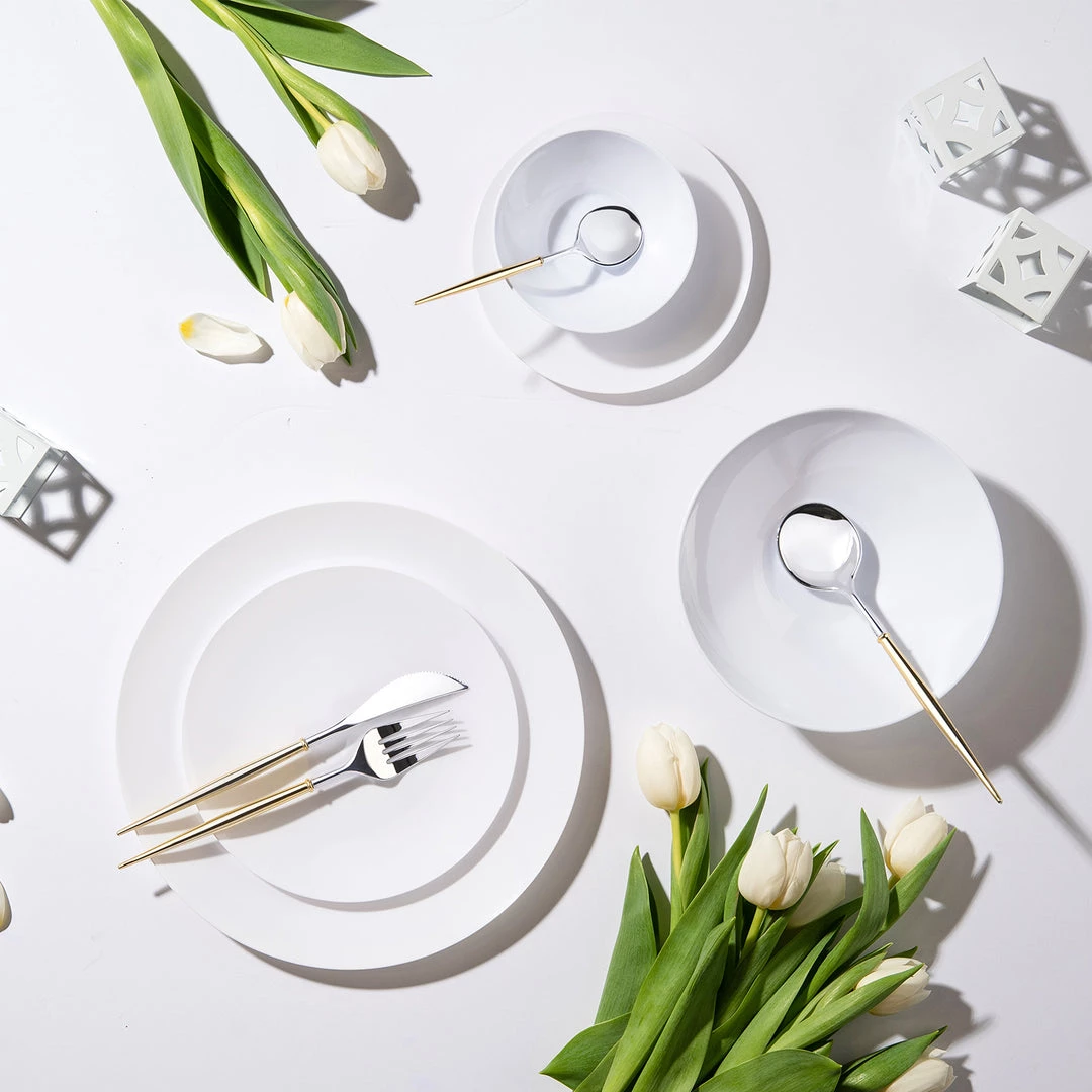 This luxurious disposable plastic plate easily gives sophisticated flair to a variety of different events. These disposable wedding dinnerware sets Great for family dinners, birthdays, celebrations, Weddings, Receptions, Baby showers, Banquets, Thanksgiving, Halloween, Christmas Holiday, Family Gatherings, business dinners and basically any event where you want your guests to feel warm, welcoming, and truly magical.