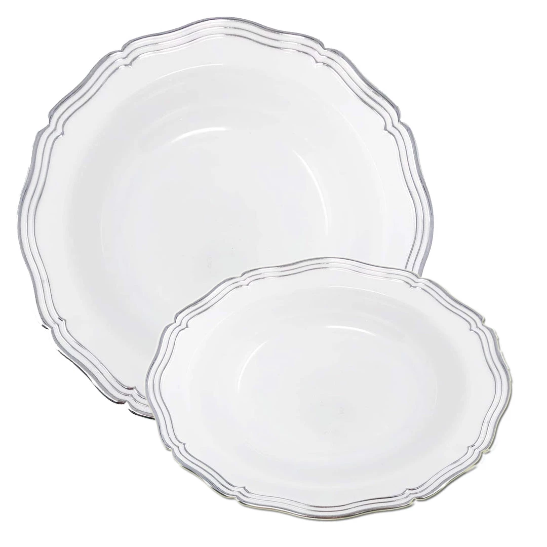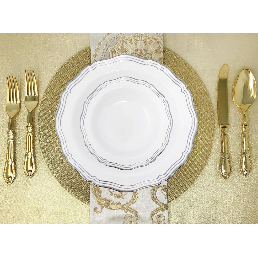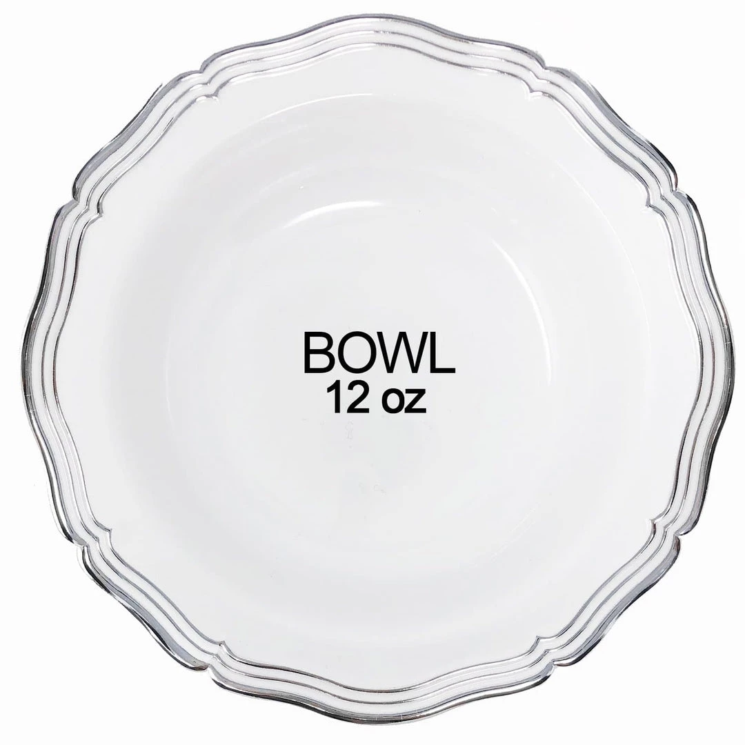 Elegant Plastic Clear Detailed Plastic Soup Bowls – 10 per Package, Stunning White and Silver Disposable Plastic Soup Bowls Ideal for Weddings and Caterers