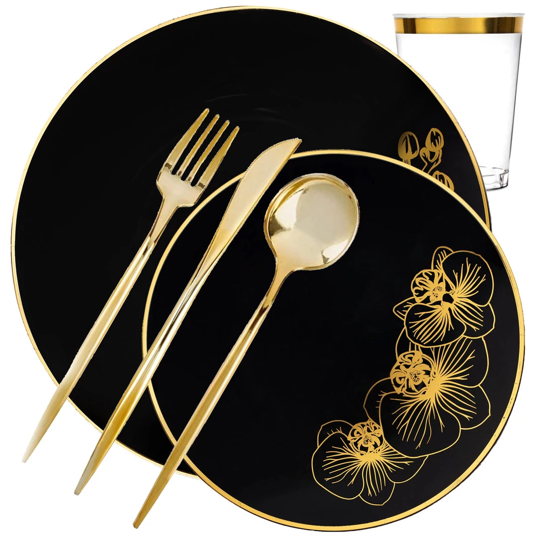This luxurious disposable plastic plate easily gives sophisticated flair to a variety of different events. These disposable wedding dinnerware sets Great for family dinners, birthdays, celebrations, Weddings, Receptions, Baby showers, Banquets, Thanksgiving, Halloween, Christmas Holiday, Family Gatherings, business dinners and basically any event where you want your guests to feel warm, welcoming, and truly magical.