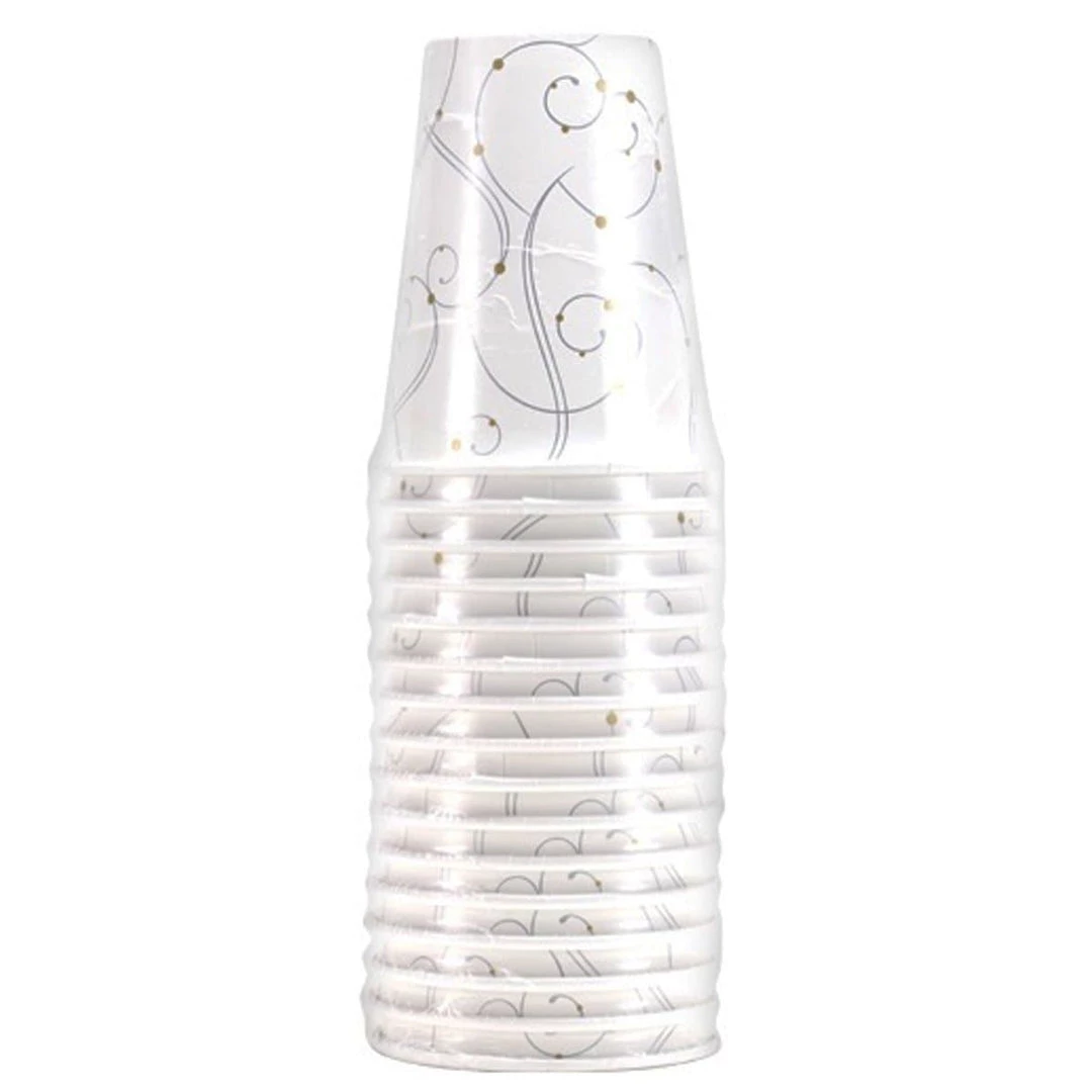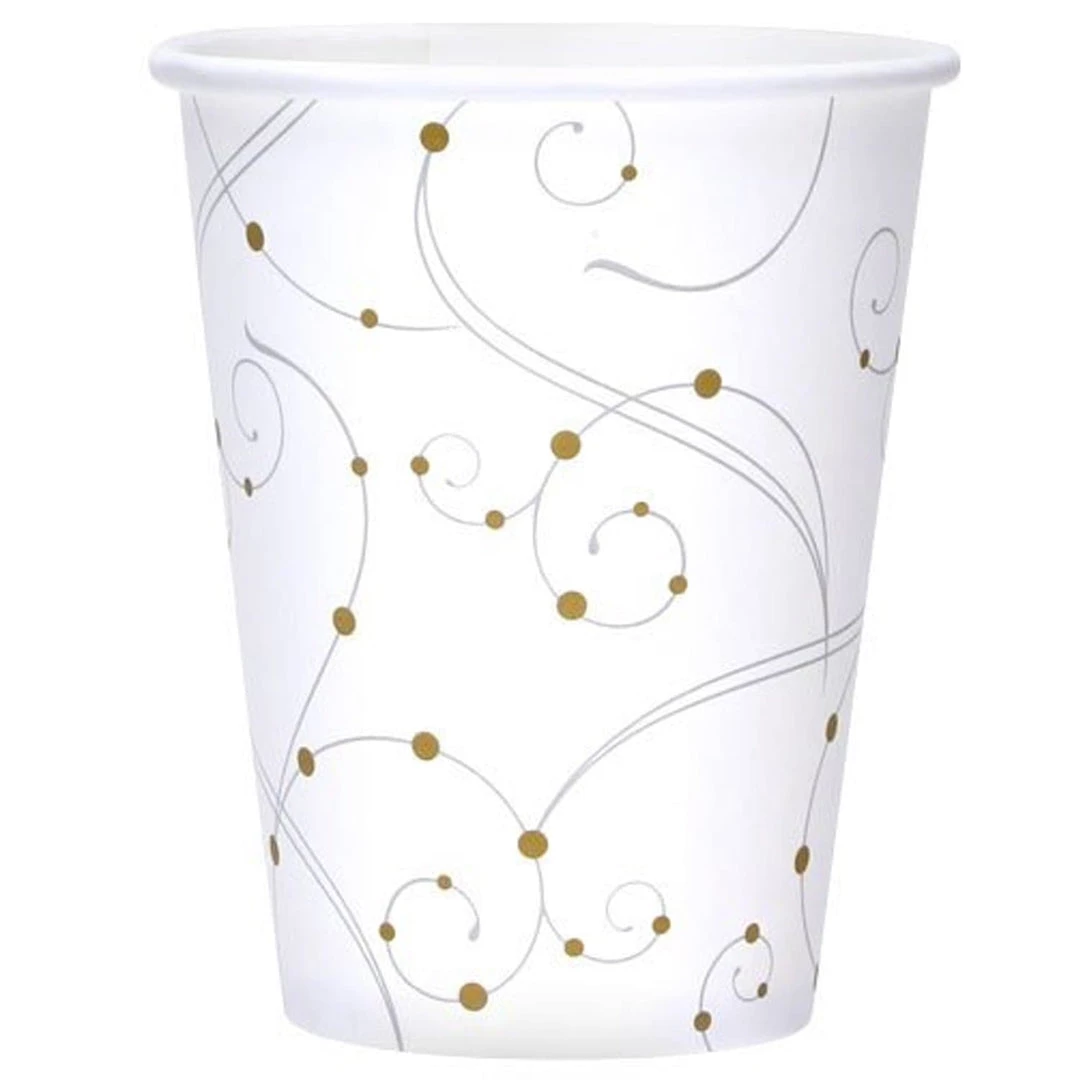 Hanna k. Signature swirls and pearls 12 oz. Paper cups, 12 count. Part of set including a 10.25″ Plate, 9″ plate, 7″ plate, lunch, beverage and bistro napkins, Table cover, and 12 oz. Cup. Designed for all occasions, banquets, dinners, parties, upscale catering, and home.