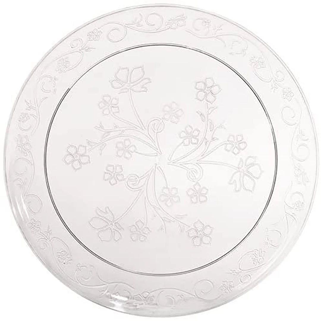 Hanna K D’VINE 9″ Clear Plastic Plate, 20 Count. Hard Plastic. Designed for all occasions, banquets, parties, upscale catering and home. Etched design of flowers, leaves and vines. Part of a Set that includes 4 plates (10″, 9″, 7″ 6.25″), bowls (10 ounce, 6 ounce) and 1 ounce shot cup. Disposable.