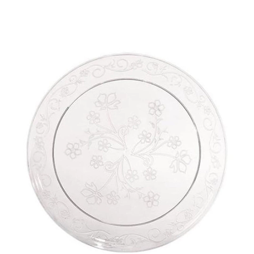 Hanna K D’VINE 7″ Clear Plastic Plate, 20 Count. Hard Plastic. Designed for all occasions, banquets, parties, upscale catering and home. Etched design of flowers, leaves and vines. Part of a Set that includes 4 plates (10″, 9″, 7″ 6.25″), bowls (10 ounce, 6 ounce) and 1 ounce shot cup. Disposable.
