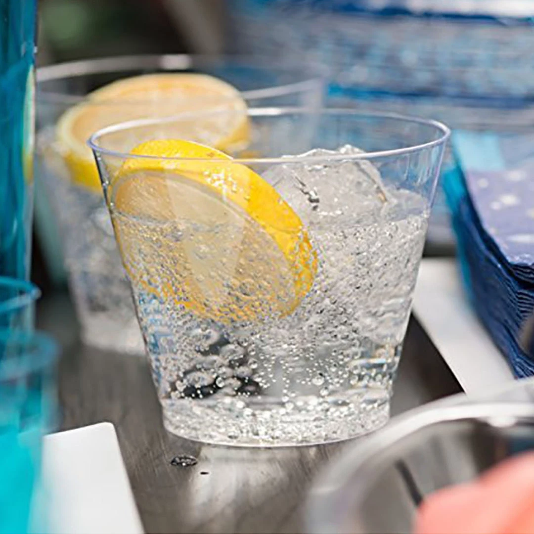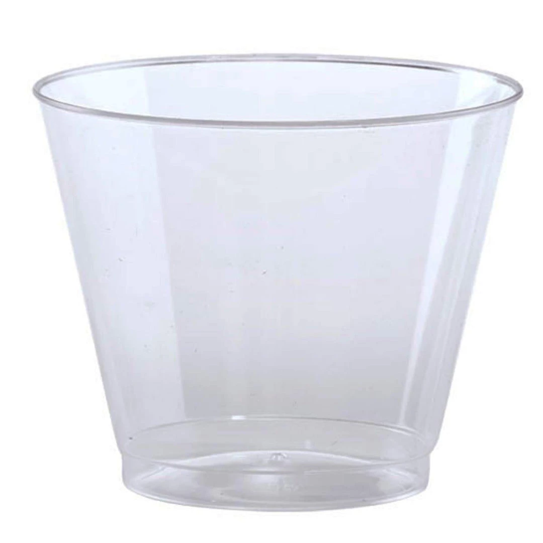 Hanna K Clear Dinnerware 9 oz. Plastic Old Fashioned Glass, 50 Count. Hard Plastic. Designed for all occasions, banquets, parties, upscale catering and home. Disposable. Great choice for buffets and events.