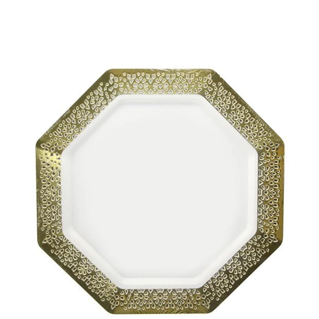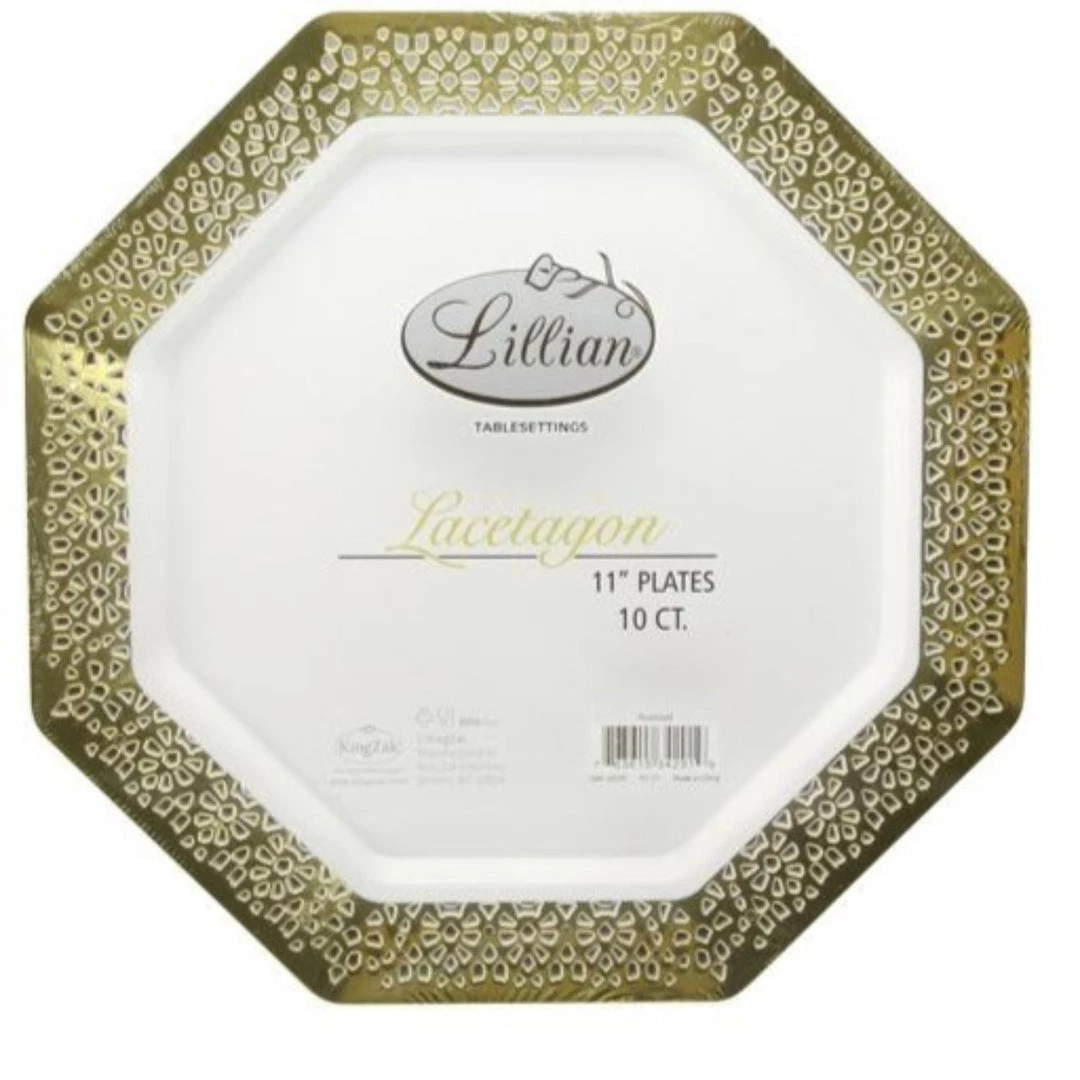 Lillian Table settings White Lacetagon 7.25-Inch Plate with Gold Rim, 10 Count. This item coordinates with our other items: Plates, Bowls, Cups, Napkins, Cutlery & Table covers. Disposable. Designed for all occasions, banquets, dinners, parties, upscale catering and home.