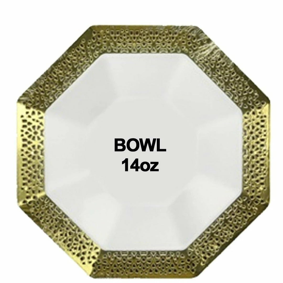 Lillian Table settings White Lacetagon 14-Ounce Bowl with Gold Rim, 10 Count. This item coordinates with our other items: Plates, Bowls, Cups, Napkins, Cutlery & Table covers. Disposable. Designed for all occasions, banquets, dinners, parties, upscale catering and home.