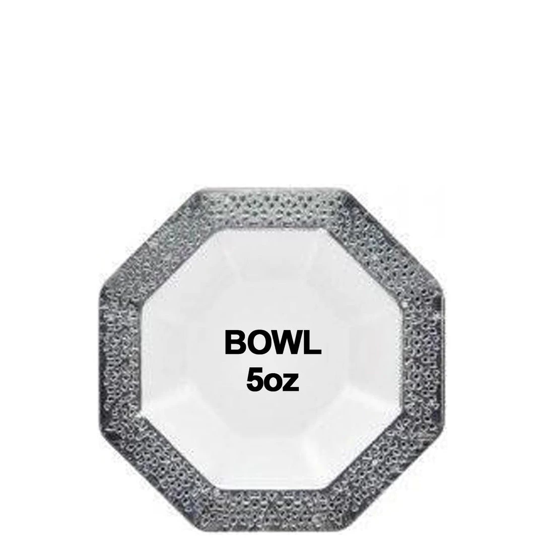 Lillian Table settings White Lacetagon 5-Ounce Bowl with Silver Rim, 10 Count. This item coordinates with our other items: Plates, Bowls, Cups, Napkins, Cutlery & Table covers. Disposable. Designed for all occasions, banquets, dinners, parties, upscale catering and home.