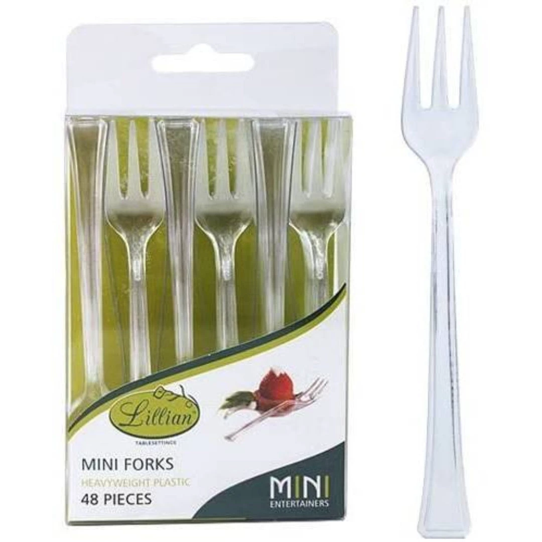 Lillian table settings mini clear plastic Forks, 48 count. This item coordinates with our many mini entertainers. The mini cutlery comes in fork, spoon, or a mix of both in clear and polished silver.