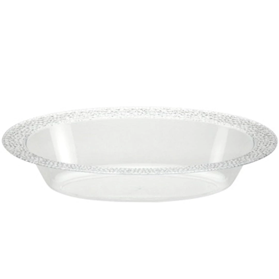 Pebbled Plastic Clear Oval Serving Bowl, 32oz 3pc. Designed for all occasions, banquets, dinners, parties, upscale catering and home. Disposable or reusable product.