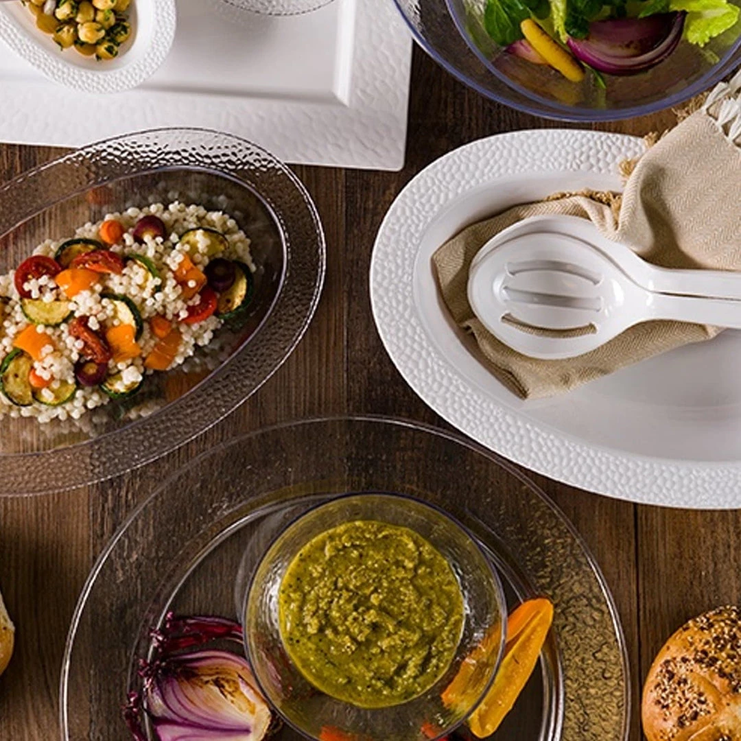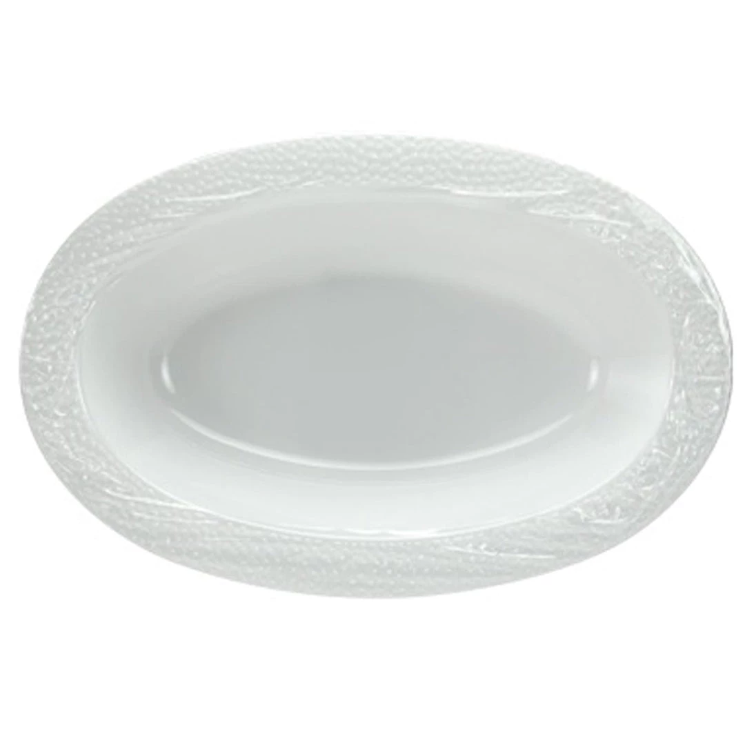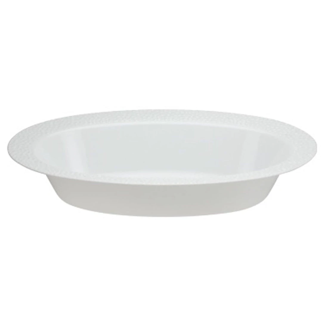 Pebbled Plastic Pearl Oval Serving Bowl, 48oz 2pc. Designed for all occasions, banquets, dinners, parties, upscale catering and home. Disposable or reusable product.