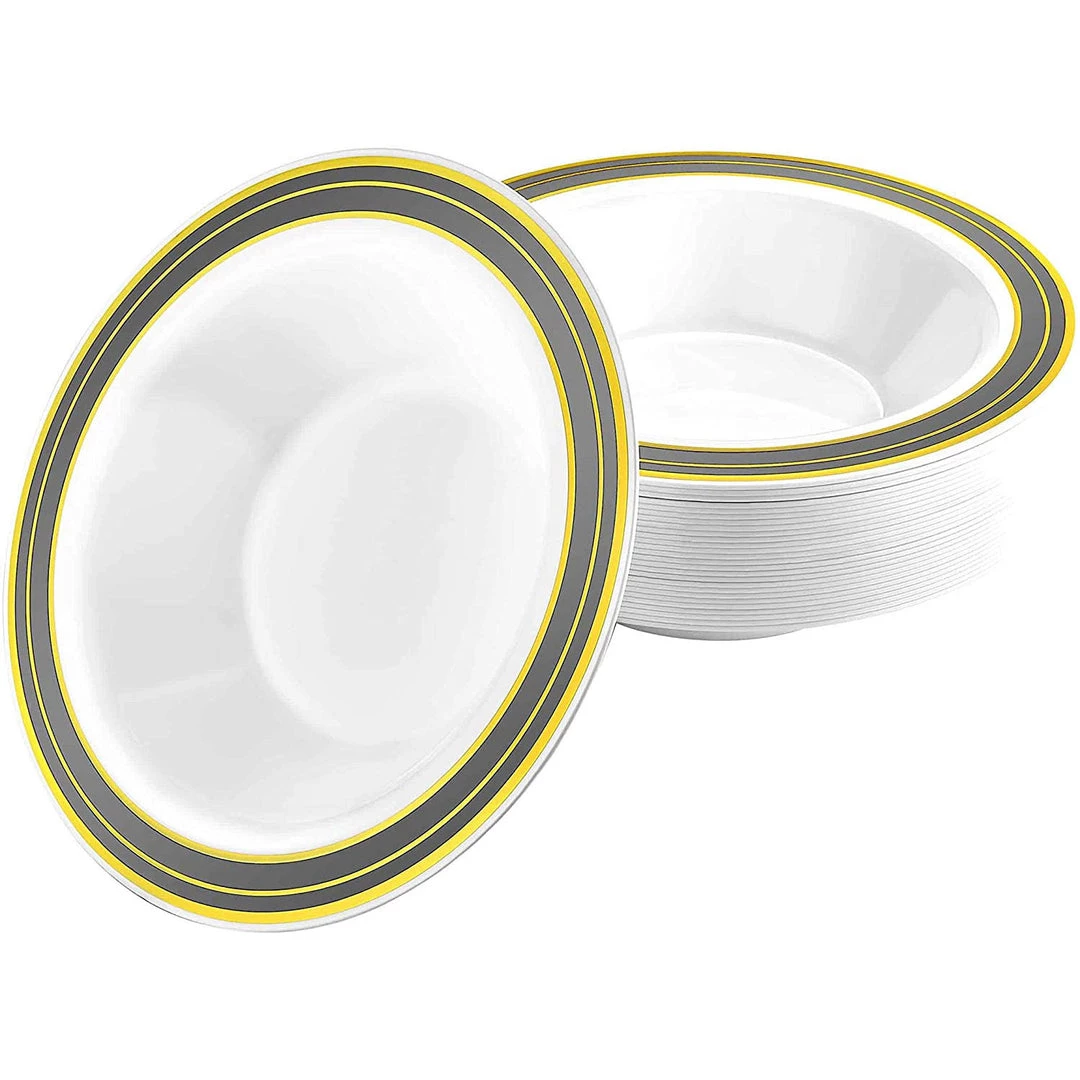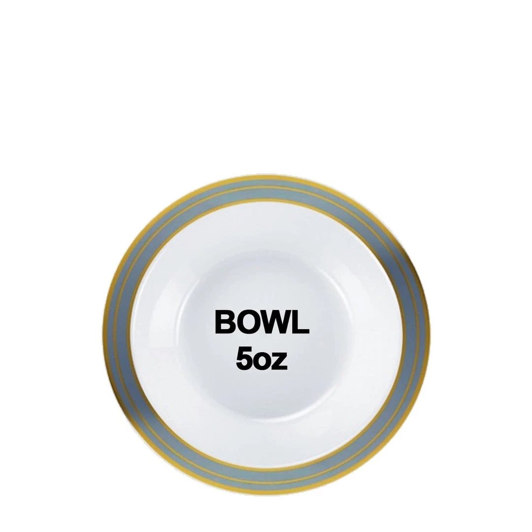 Lillian Table settings Magnificence Platinum 5oz Plastic Bowl, 10 count. Magnificence Platinum 5 ounce Bowls. Metallic Gold and Silver rings on the outer edge giving this design the look of real porcelain dishes. Designed for all occasions, banquets, dinners, parties, upscale catering, and home.