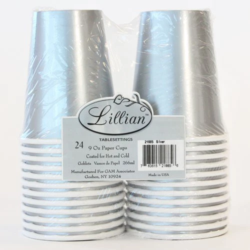 Lillian Silver 9-Ounce Twin Stack Cups, 24 pieces. Part of a set that includes 10″ & 7″ plate, 9-Ounce Cup, Luncheon, Beverage and Bistro Napkin. Textured Series comes in 9 Colors: Green, Purple, Silver, Gold, Cream, Burgundy, Blue, Orange and Pink. Designed for all occasions, banquets, parties, upscale catering and home. Disposable.