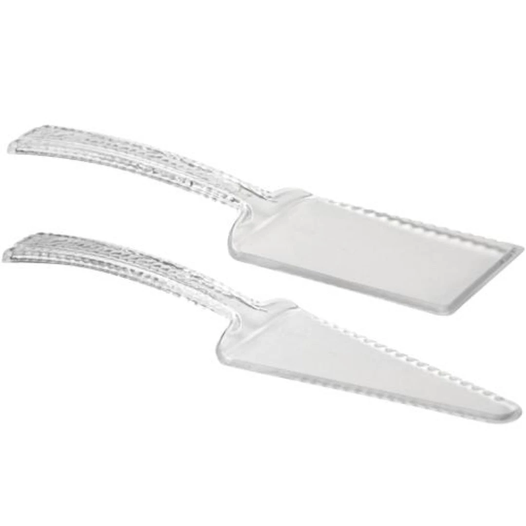 Each package contains 2 heavyweight clear cake servers. They feature a pebbled design on the handles. Each piece is about 10″ long and have a serrated edge for easier serving.