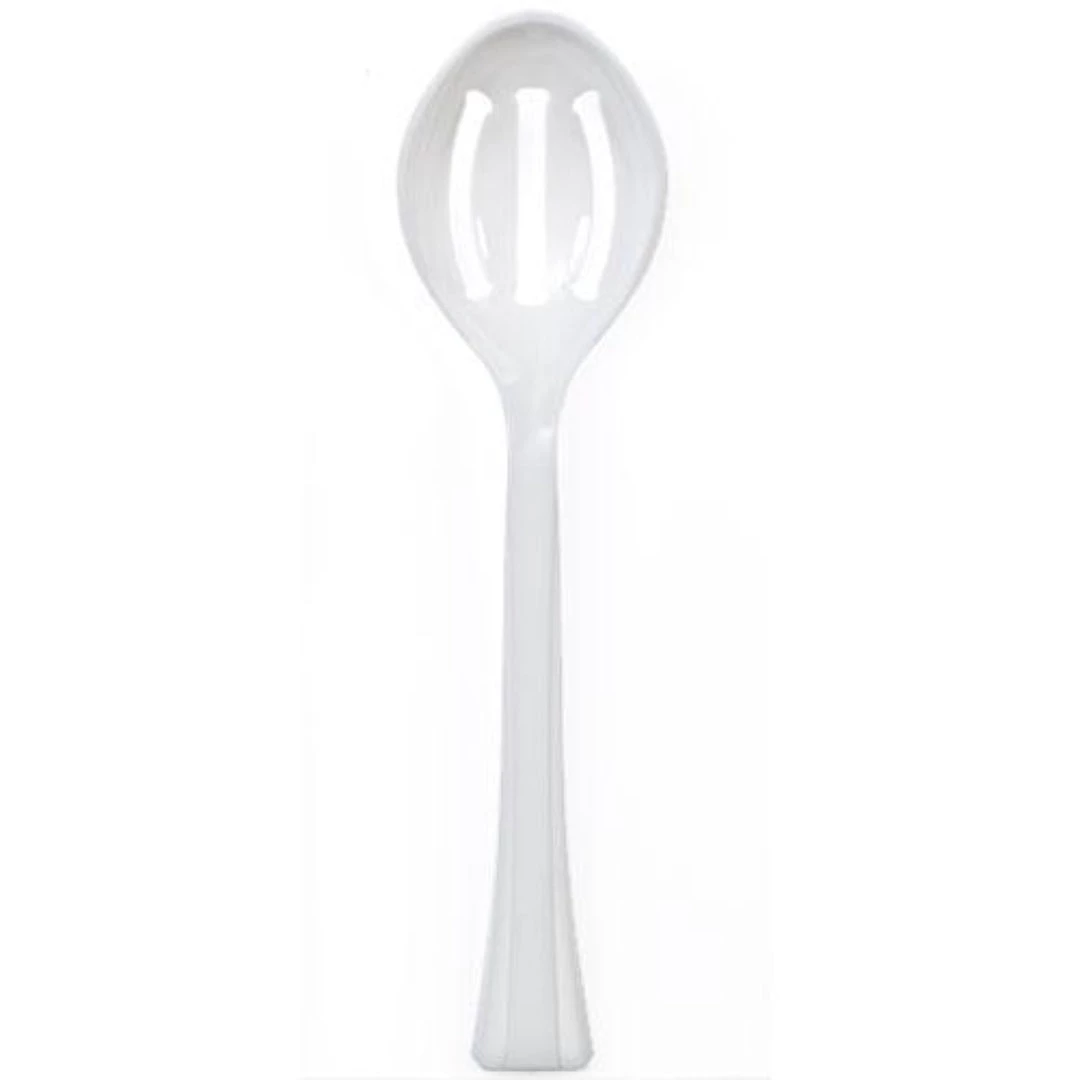 Lillian Plastic Slotted Salad Serving Spoon, Pearl, 1 unit. Designed for all occasions, banquets, parties, upscale catering, and home. Disposable.