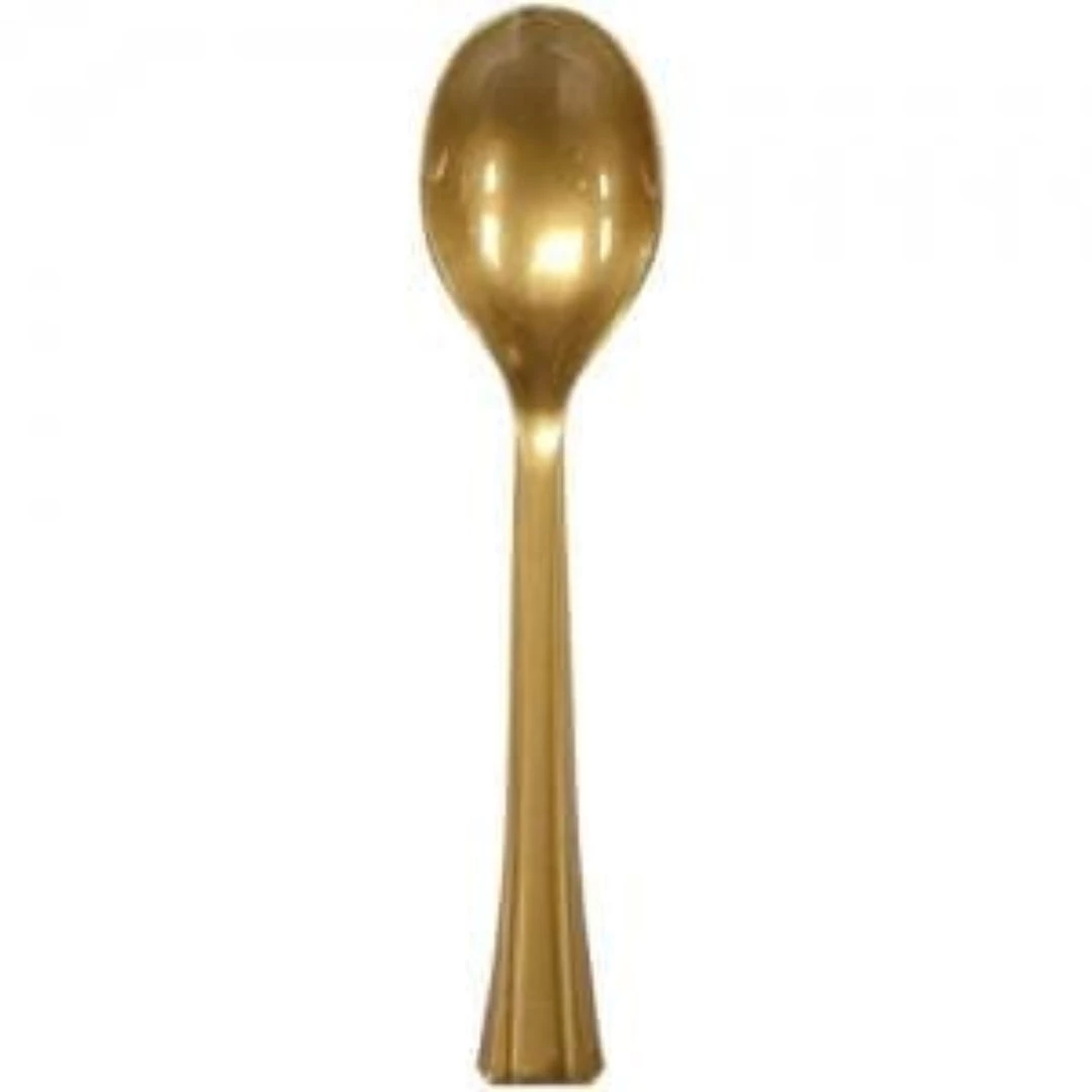 Lillian table settings gold premium plastic Soup Spoons 48 count. This cutlery can be purchased in matching bagged 48 count separates of fork, teaspoon, soup spoon, knife or 24 count combo. This style cutlery comes in 5 colors: clear, pearl (white), Sahara (off-white), gold and silver. Please view our whole Lillian table settings line for coordinating plates, bowls, napkins, serve ware and drink ware.
