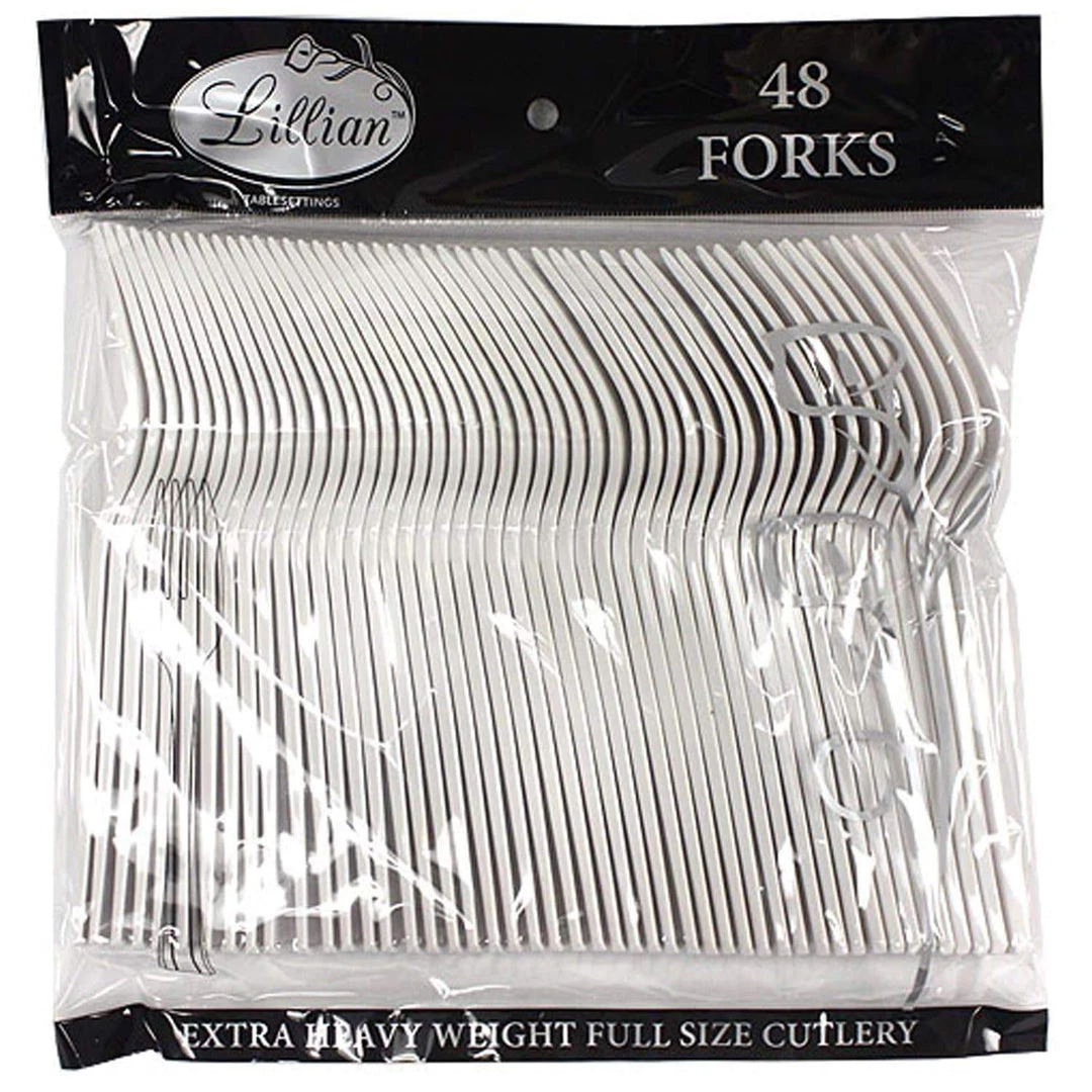 Lillian table settings pearl premium plastic fork 48 count. This cutlery can be purchased in matching bagged 48 count separates of fork, teaspoon, soup spoon, knife or 24 count combo. This style cutlery comes in 5 colors: clear, pearl (white), Sahara (off-white), gold and silver. Please view our whole Lillian table settings line for coordinating plates, bowls, napkins, serve ware and drink ware.