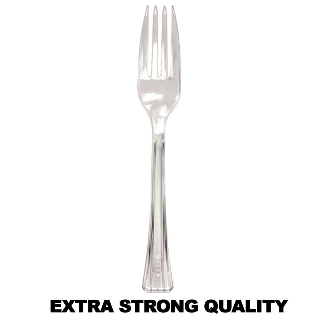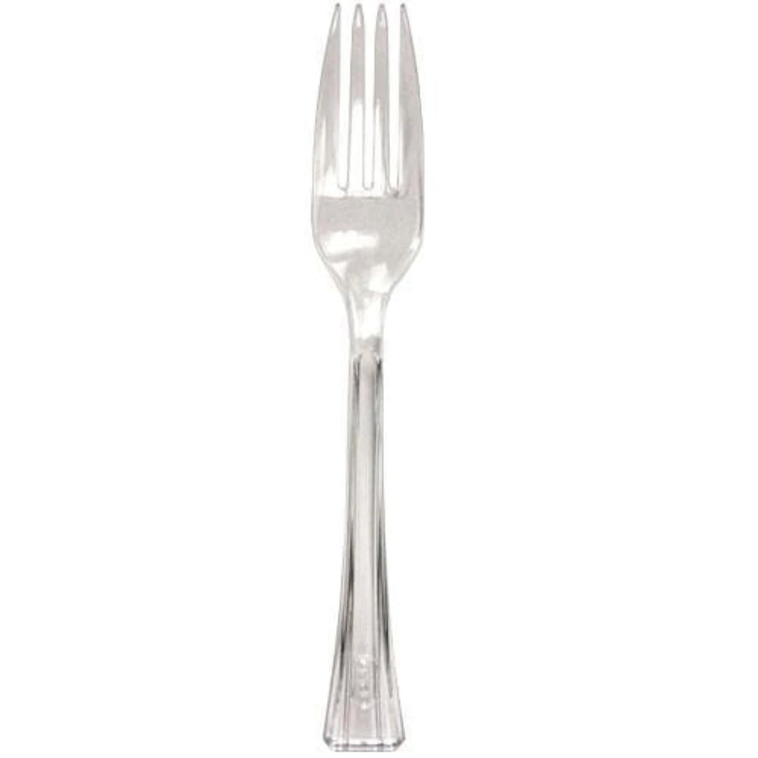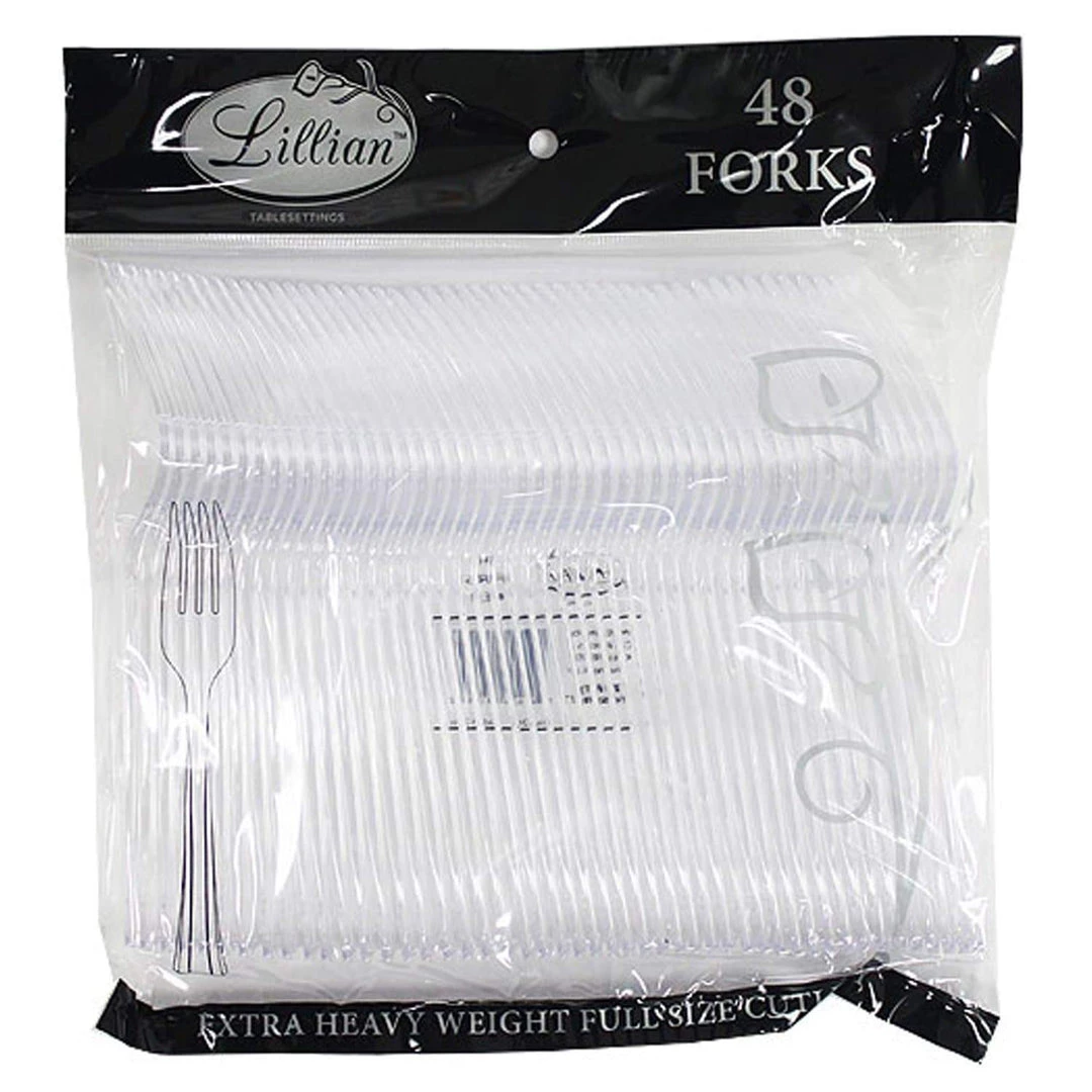 Lillian table settings clear premium plastic Plastic Forks 48 count. This cutlery can be purchased in matching bagged 48 count separates of fork, teaspoon, soup spoon, knife or 24 count combo. This style cutlery comes in 5 colors: clear, pearl (white), Sahara (off-white), gold and silver. Please view our whole Lillian table settings line for coordinating plates, bowls, napkins, serve ware and drink ware.