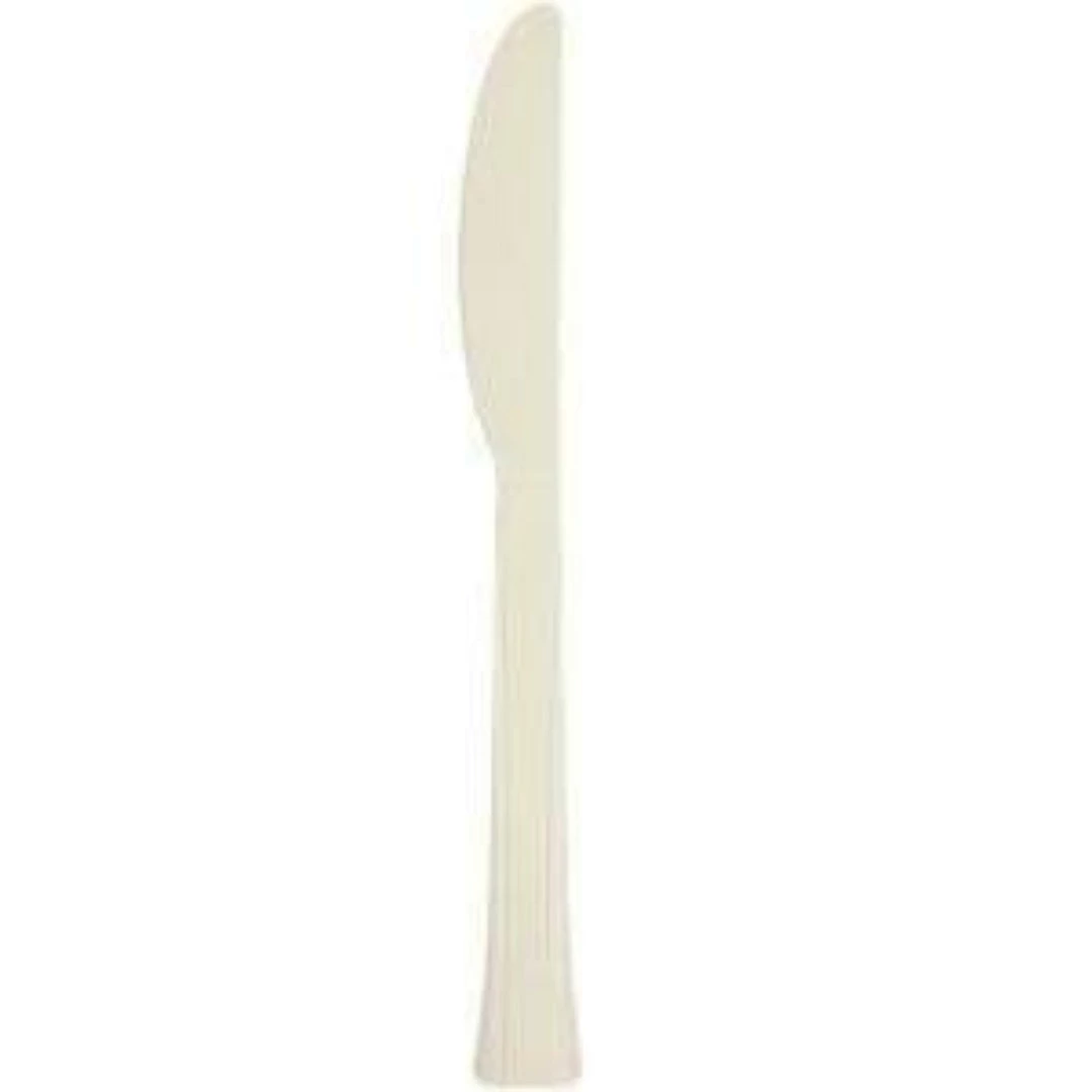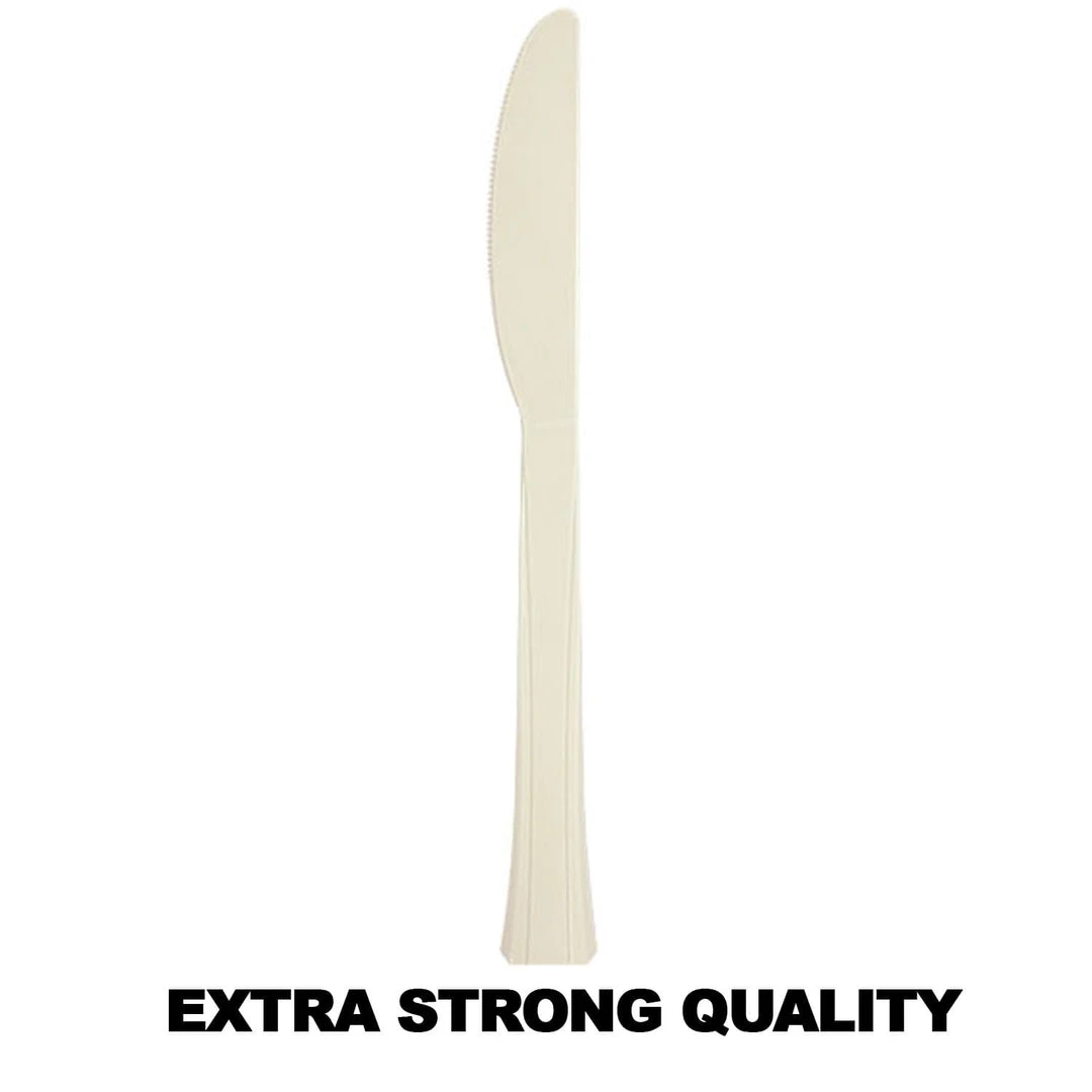 Lillian table settings Sahara premium plastic Knives 48 count. This cutlery can be purchased in matching bagged 48 count separates of fork, teaspoon, soup spoon, knife or 24 count combo. This style cutlery comes in 5 colors: clear, pearl (white), Sahara (off-white), gold and silver. Please view our whole Lillian table settings line for coordinating plates, bowls, napkins, serve ware and drink ware.