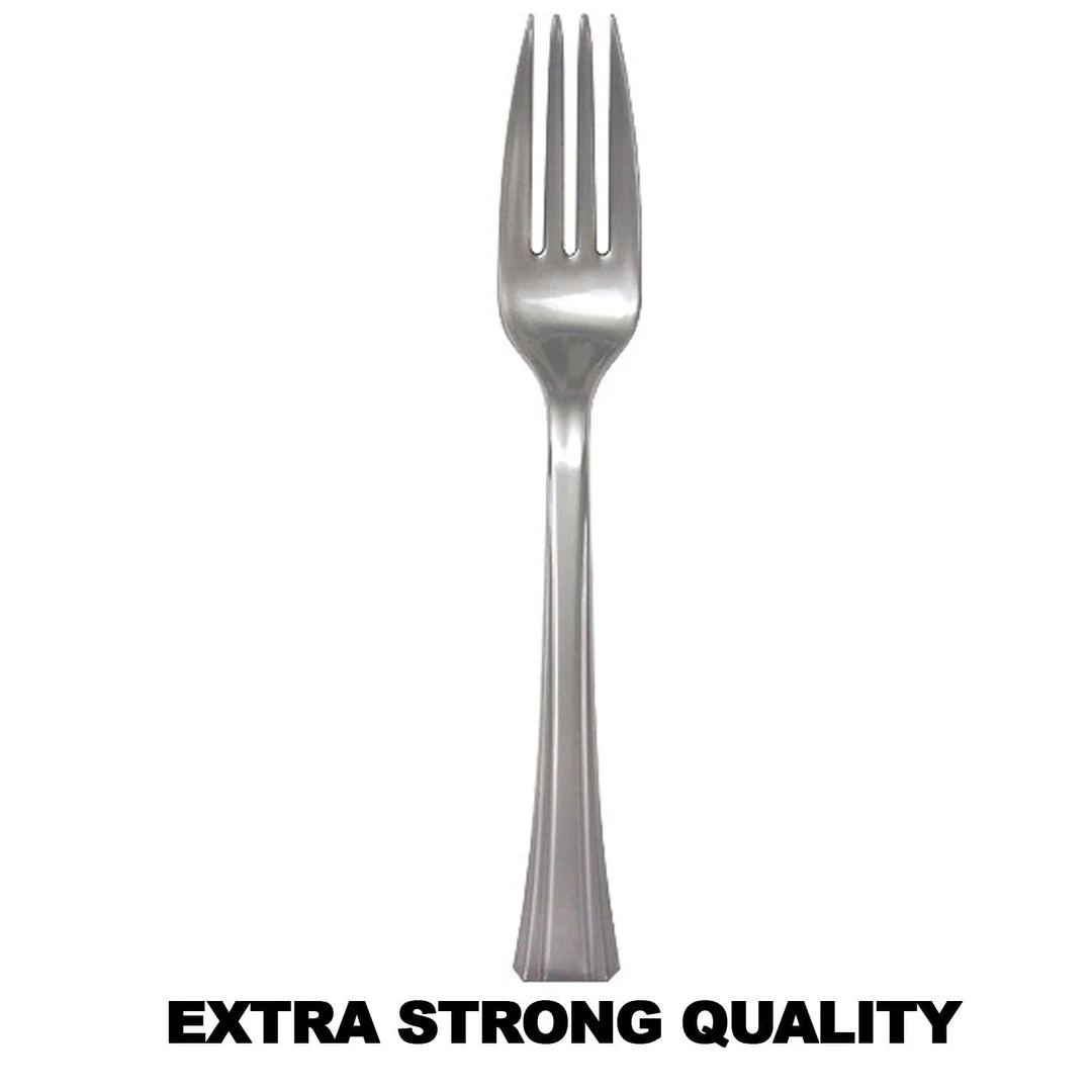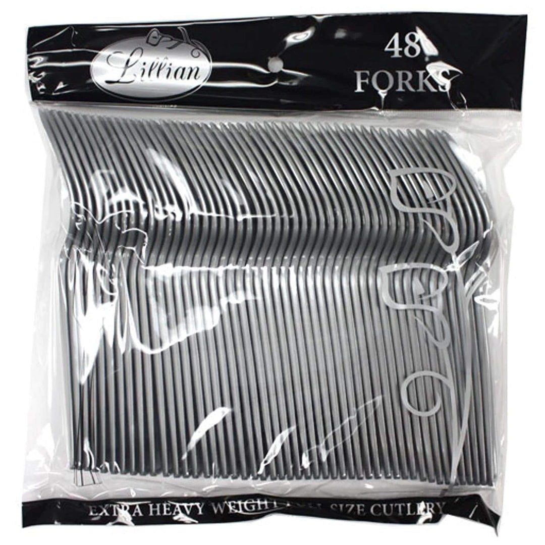 Lillian table settings silver premium plastic fork 48 count. This cutlery can be purchased in matching bagged 48 count separates of fork, teaspoon, soup spoon, knife or 24 count combo. This style cutlery comes in 5 colors: clear, pearl (white), Sahara (off-white), gold and silver. Please view our whole Lillian table settings line for coordinating plates, bowls, napkins, serve ware and drink ware.