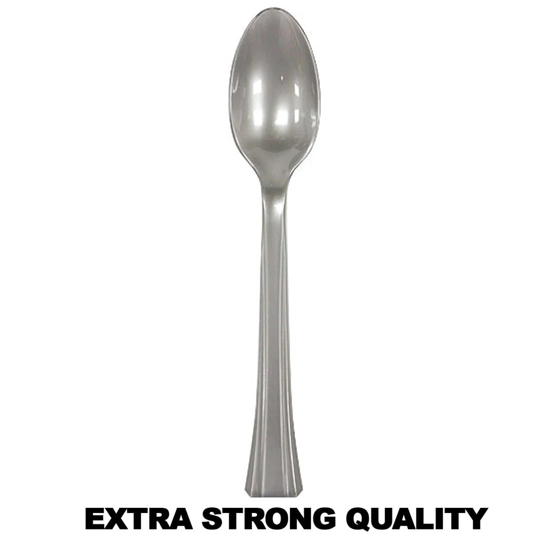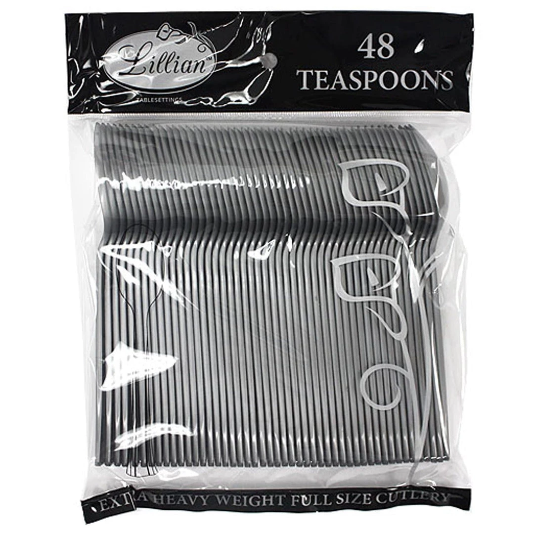 Lillian table settings silver premium plastic teaspoon 48 count. This cutlery can be purchased in matching bagged 48 count separates of fork, teaspoon, soup spoon, knife or 24 count combo. This style cutlery comes in 5 colors: clear, pearl (white), Sahara (off-white), gold and silver. Please view our whole Lillian table settings line for coordinating plates, bowls, napkins, serve ware and drink ware.