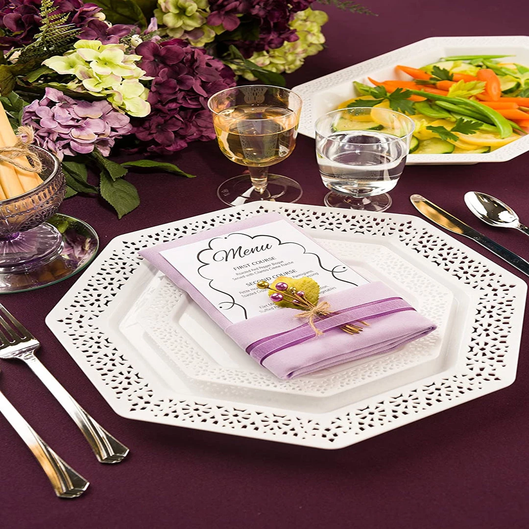 Lillian Table settings LACETAGON 9.25″ White Plastic Plate, 10 Count. Octagonal plastic plates with lace-style cutout around rim. BPA Free. Designed for all occasions, banquets, dinners, parties, upscale catering and home. Disposable Products.