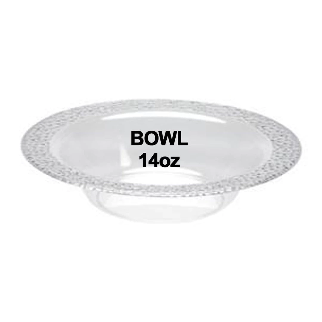 Lillian Table settings Clear Pebbled 14-Ounce Plastic Bowl, 10 Count. This item coordinates with our other items: Plates, Bowls, Cups, Napkins, Cutlery & Table covers. Disposable. Designed for all occasions, banquets, dinners, parties, upscale catering and home.