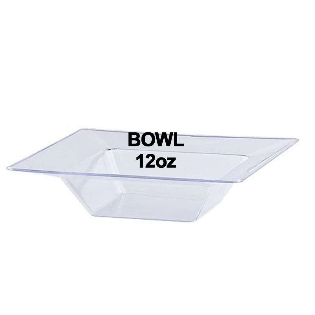 Lillian table settings clear 12 oz. square plastic dinner bowl, 10 count. This item is part of a set that (sold separately) includes a 10.25″, 9.5″, 8″ and 6.5″ Plates and 12 oz. And 5 oz. Bowls. This item comes in 3 colors: clear, pearl and cream. Designed for all occasions, banquets, parties, upscale catering and home. Disposable product.