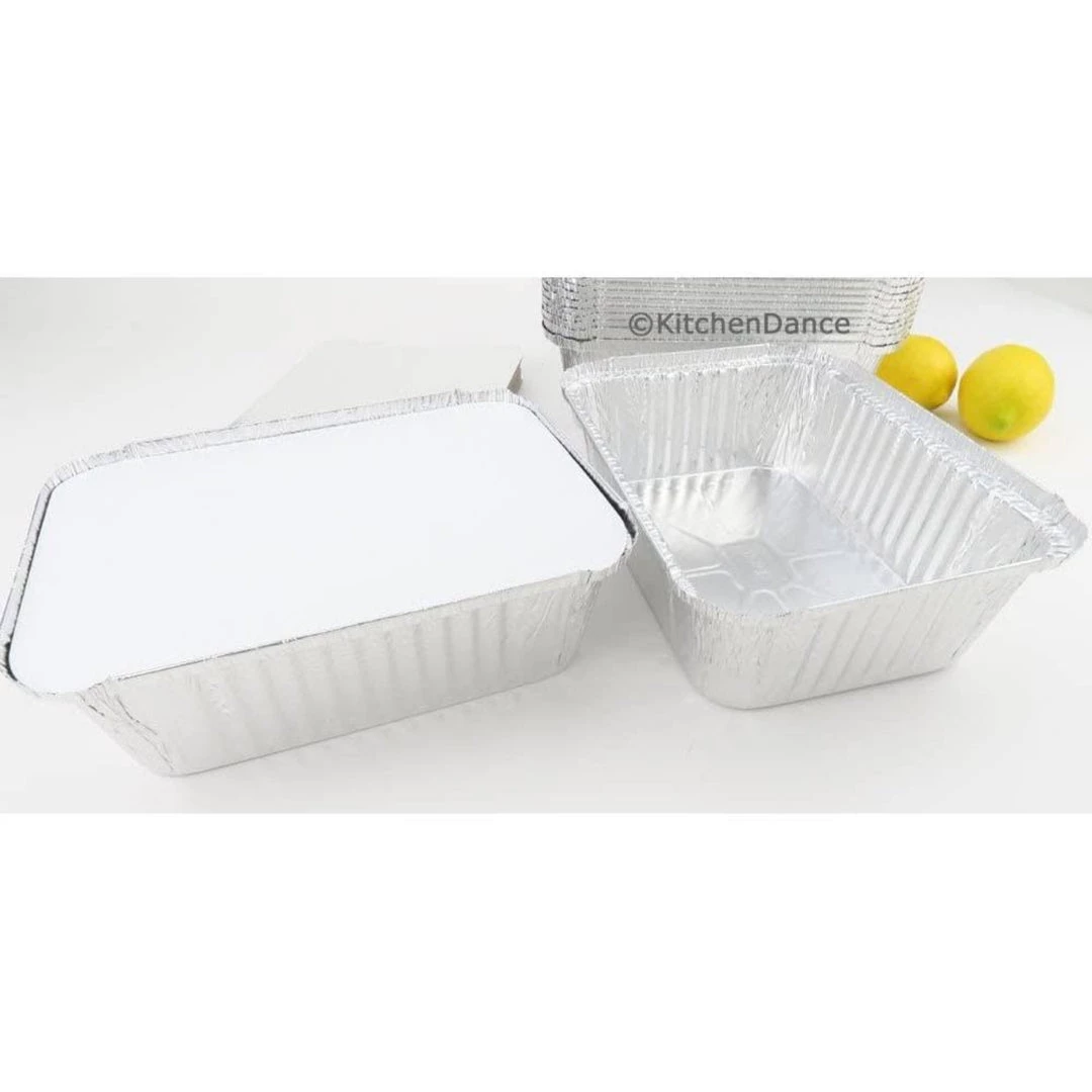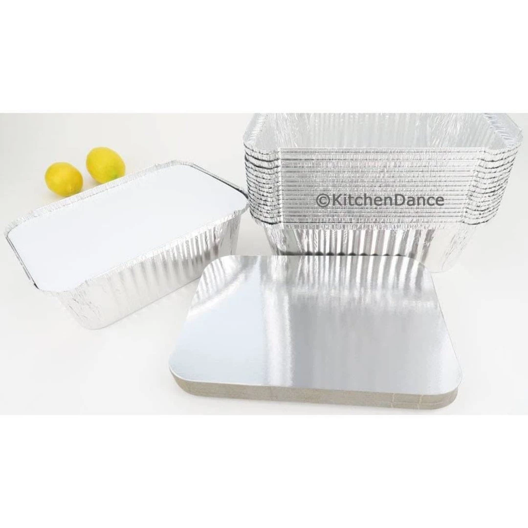 Oblong board lid, which is heavy white paper on one side and aluminized on the other. Lid fits snug into the top of the pan and you crimp it down so it holds securely. This is a great general use item – you can cook, freeze and store in this pan.