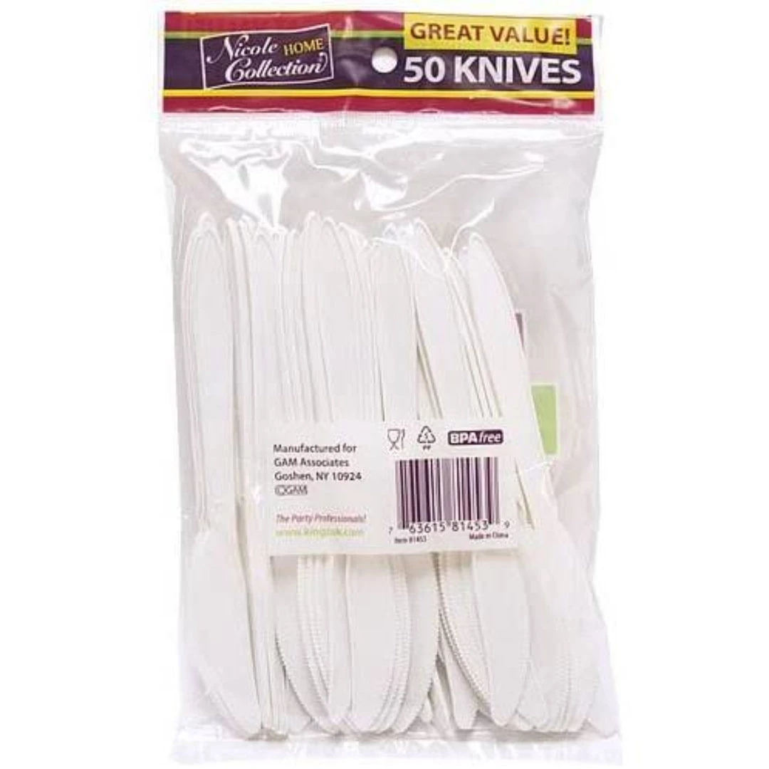 Nicole Home Collection White Medium Weight Knife, 50 Count. This item is part of a set that includes 50 count separates (Fork, Knife, Teaspoon, Soupspoon) and a cutlery combo, 48 count. Designed for all occasions, banquets, dinners, parties, upscale catering and home. Disposable Products.
