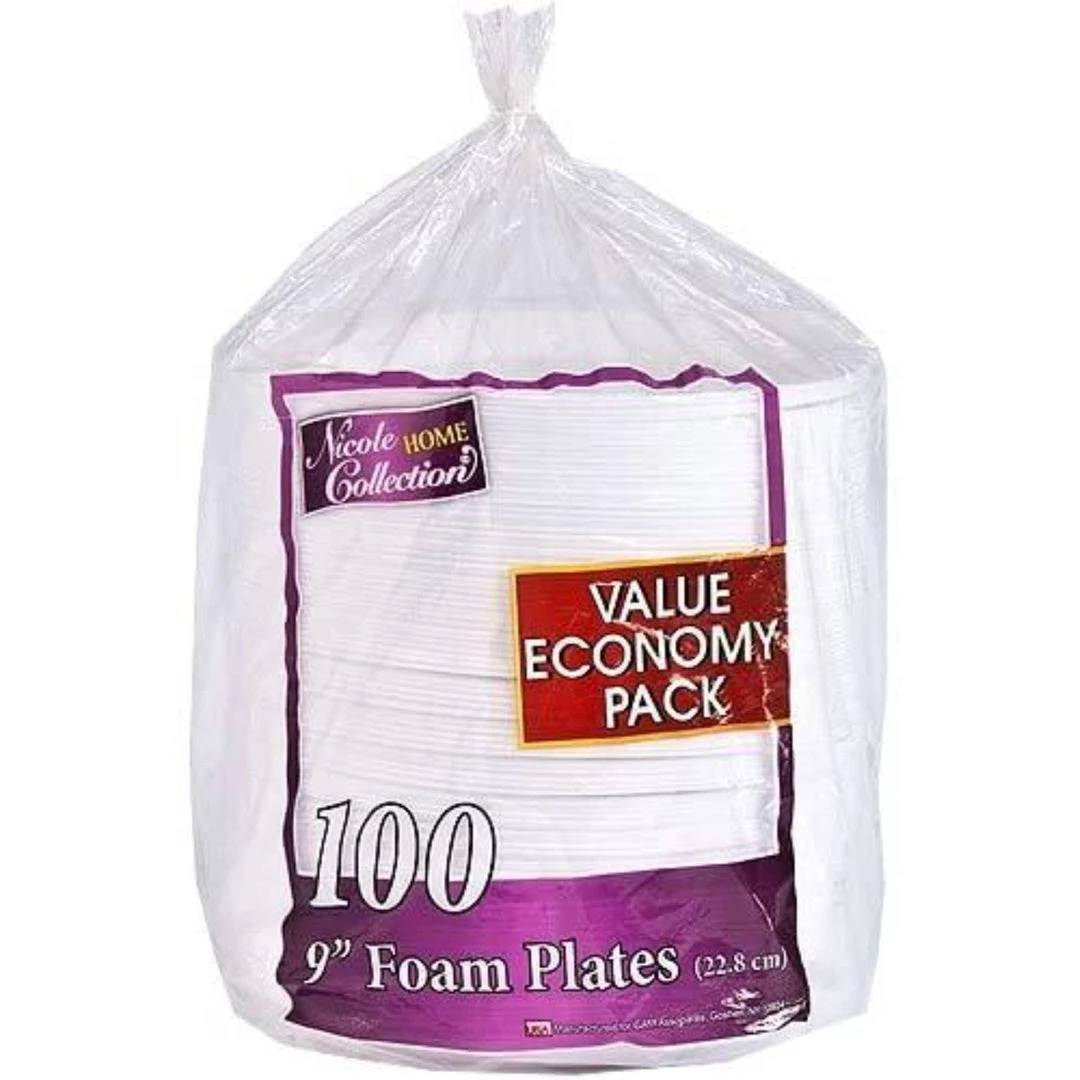 Nicole Home Collection White Everyday Dinnerware 9″ Foam Plate, 100 Count. Designed for all occasions, banquets, parties, upscale catering and home. Disposable.