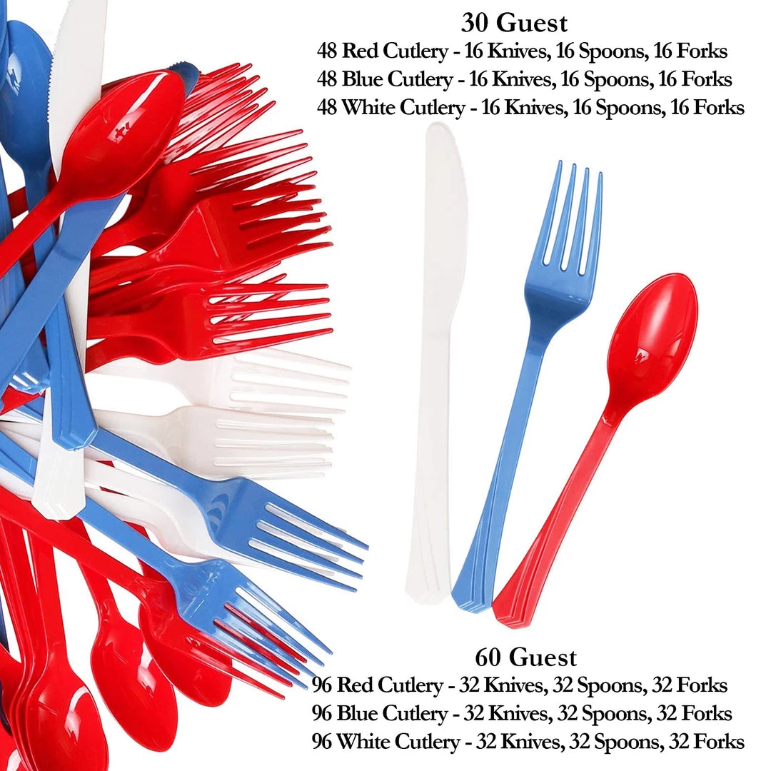 - 48 Red Cutlery – 16 Knives, 16 Spoons, 16 Forks + 48 Blue Cutlery – 16 Knives, 16 Spoons, 16 Forks + 48 White Cutlery – 16 Knives, 16 Spoons, 16 Forks