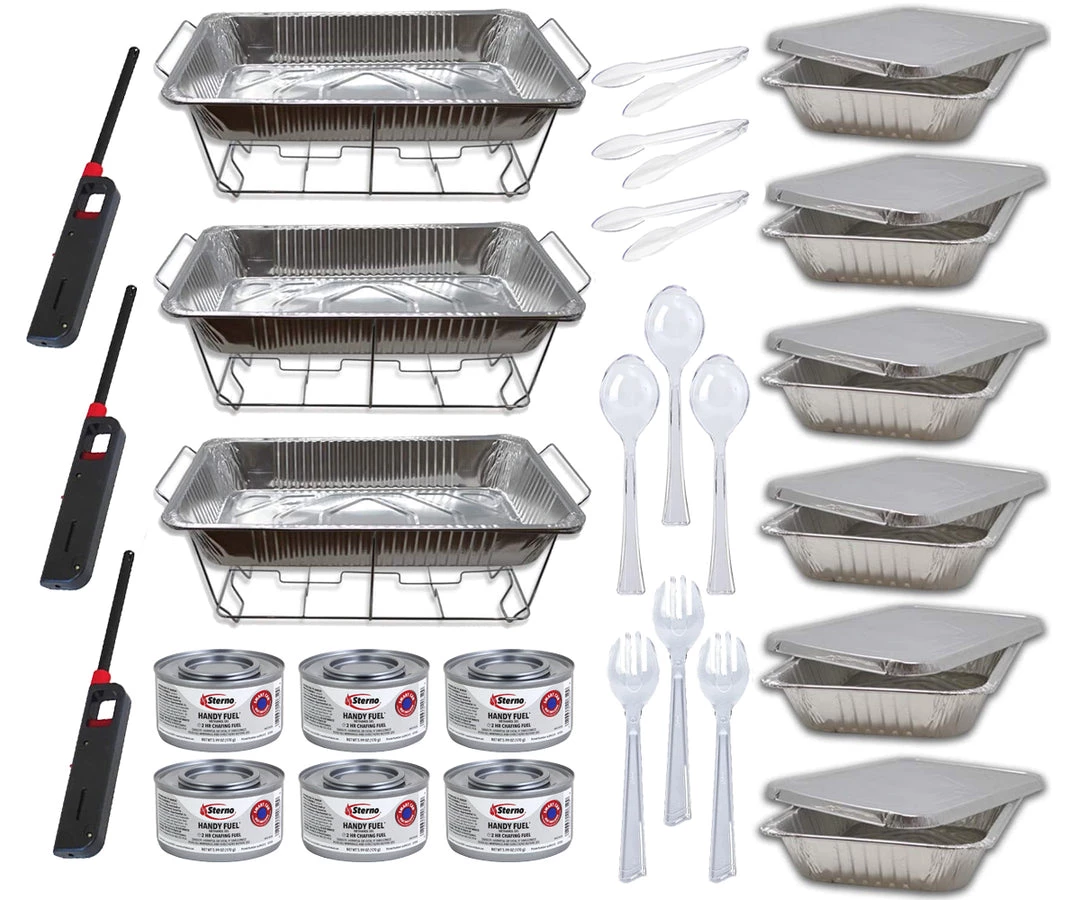 Entertain like a pro! This Buffet Serving Kit Chafing Dish Buffet Set comes with all the pans, racks, fuel, and serving utensils you need to serve a piping hot meal of six dishes in virtually any setting. Just pour a little hot water into the full-size steam Baking pans, add the half pans with food, place them all on the racks, and light the ethanol gel below.