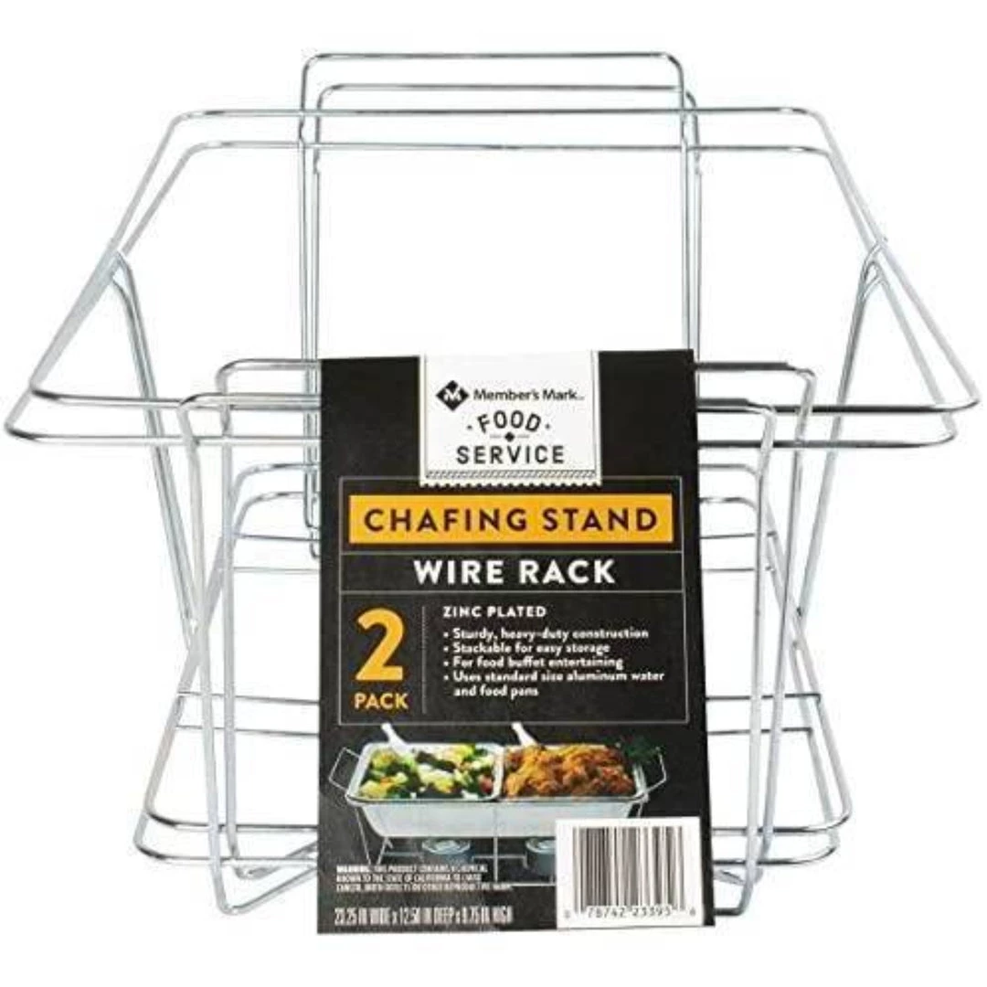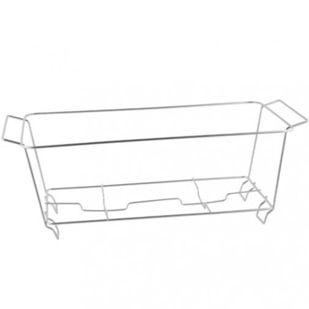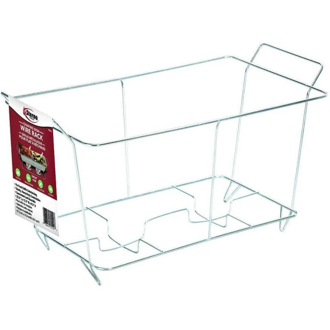 Use this Darling Food Service full size wire chafing rack to hold full size Disposable aluminum pan, Convenient solution for catered events Features a versatile silver coloring and wire frame design Includes built‐in support for 2 fuel canisters Large enough to hold a full size steam table pan Perfect for self‐service buffet‐style occasions.
