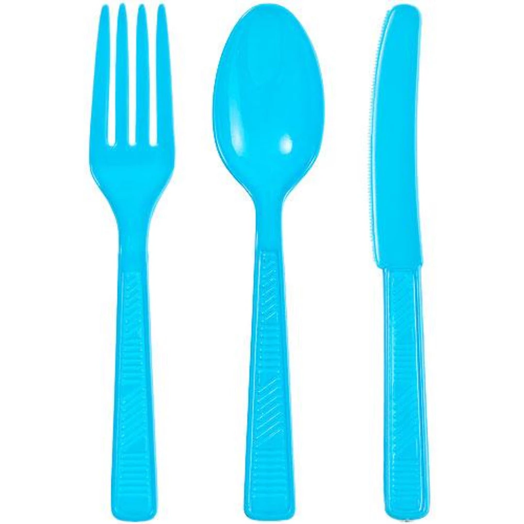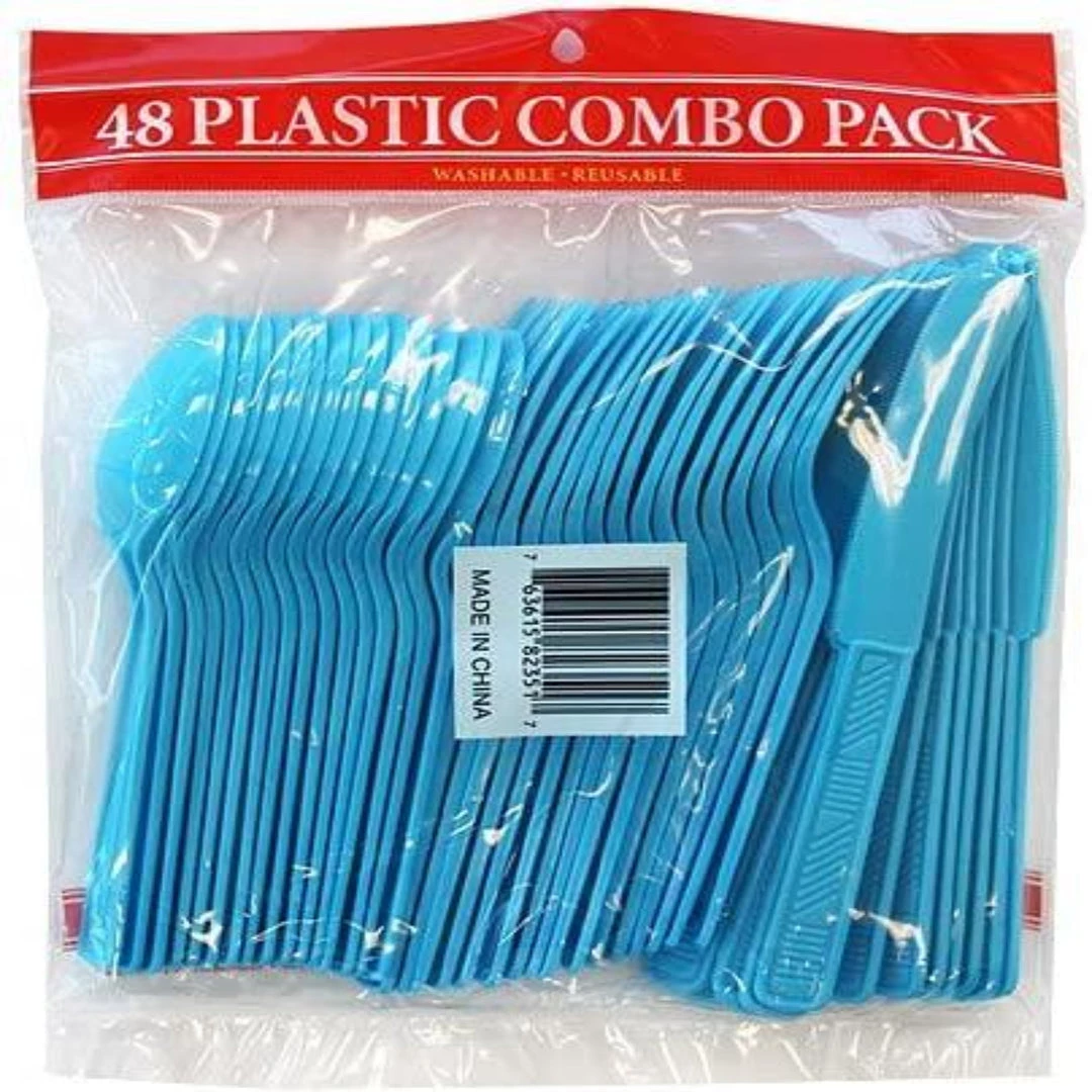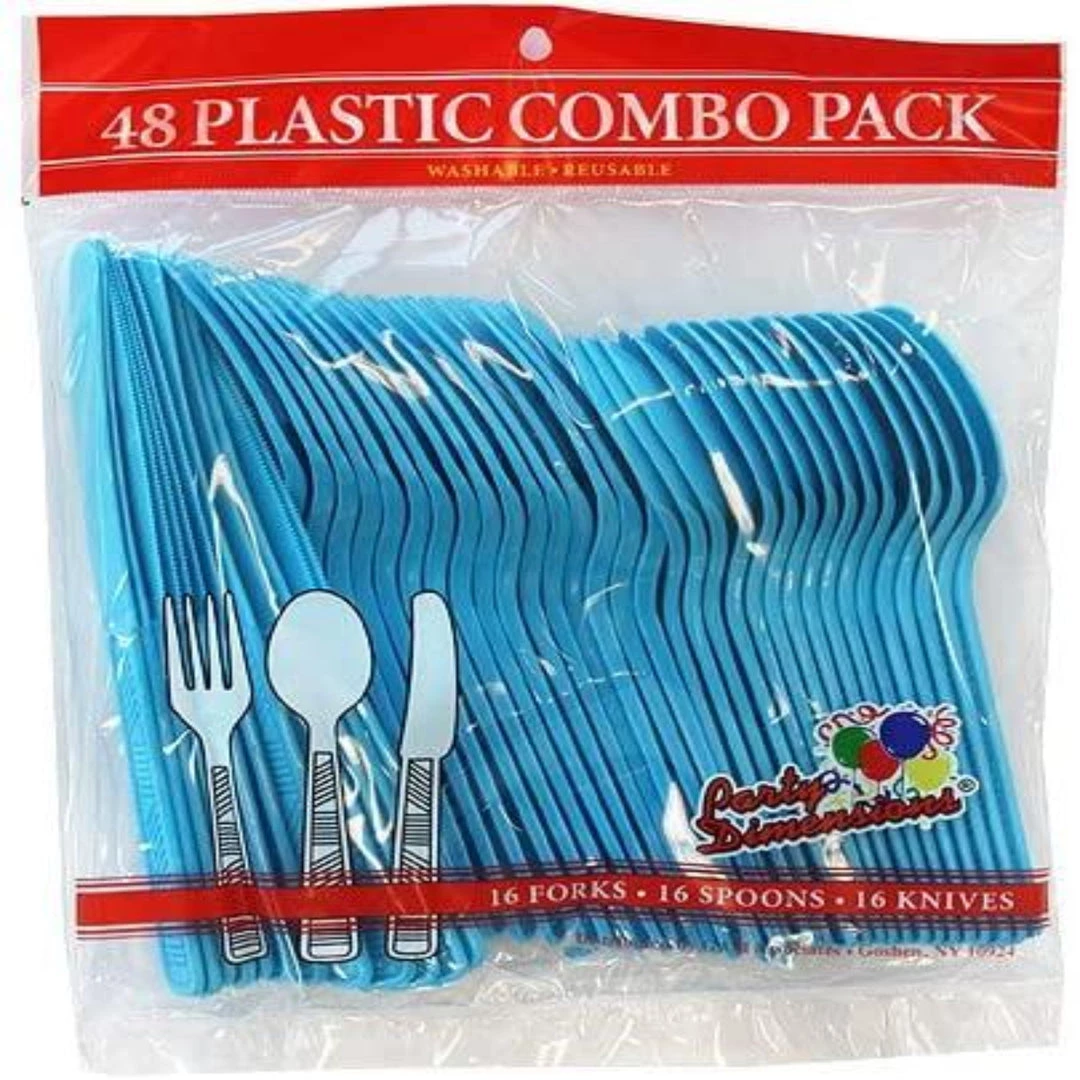 Party Dimensions Island Blue Plastic Cutlery Combo (16 each: fork, knife, teaspoon), 48 count. This item is part of a cutlery set that includes Forks, Spoons, Knives and Soup Spoons that come 48 pieces of cutlery to a bag. There are also 2 bags of combo cutlery in this color that can be purchased in either a 48 count or 36 count. Also, matching dinnerware for this color can be found in either Plastic: Plates, Bowls, Cups or Paper: Plates, Cups and Napkins. Designed for all occasions, banquets, dinners, parties, upscale catering and home.