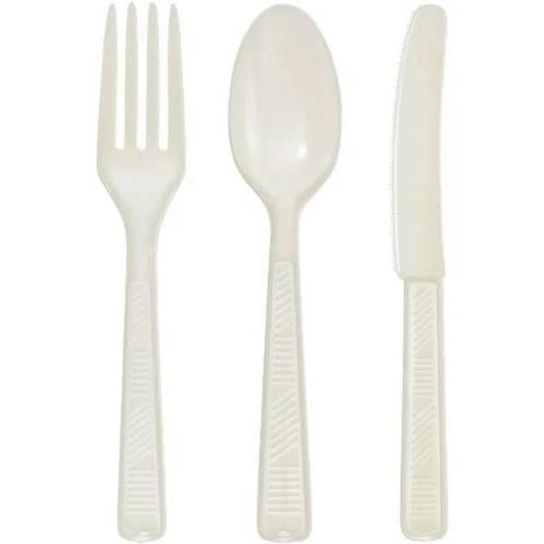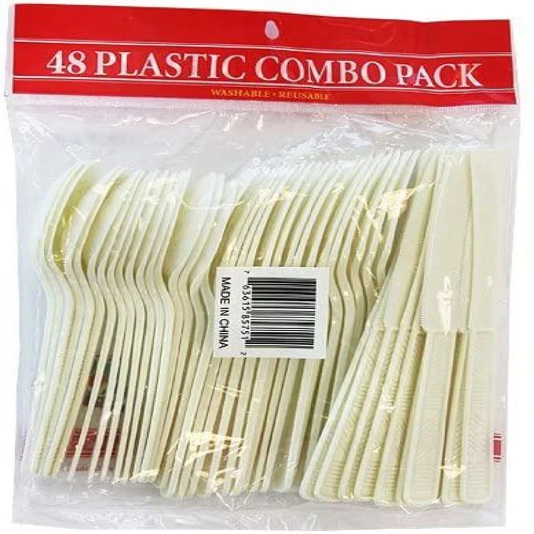 Party Dimensions Ivory Plastic Cutlery Combo, 48 Pieces. (16 Forks, 16 Spoons, 16 Knives) Designed for all occasions, banquets, parties, upscale catering and home. Disposable.
