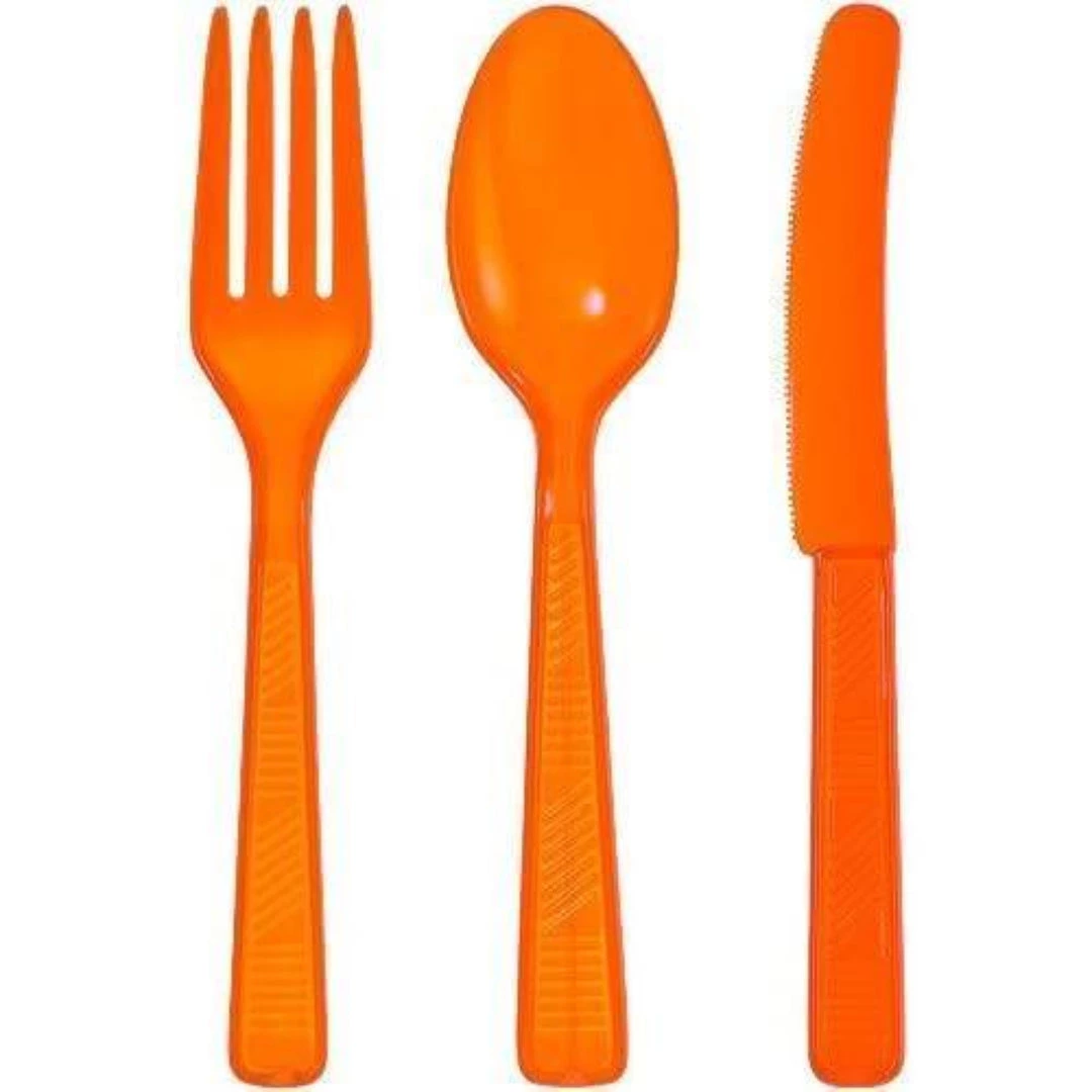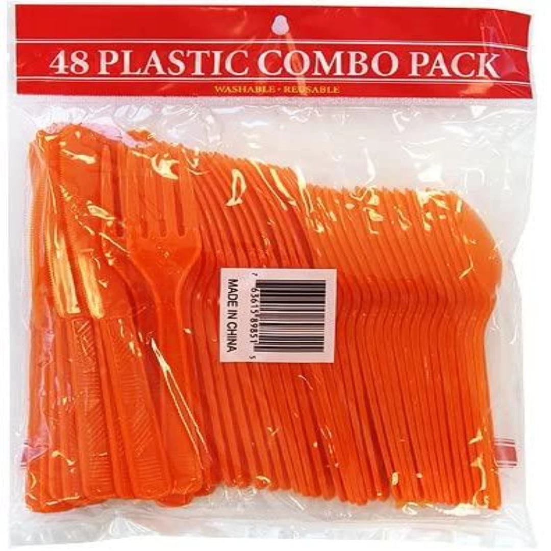 Party Dimensions Orange Plastic Cutlery Combo, 48 Pieces. (16 Forks, 16 Spoons, 16 Knives) Designed for all occasions, banquets, parties, upscale catering and home. Disposable.
